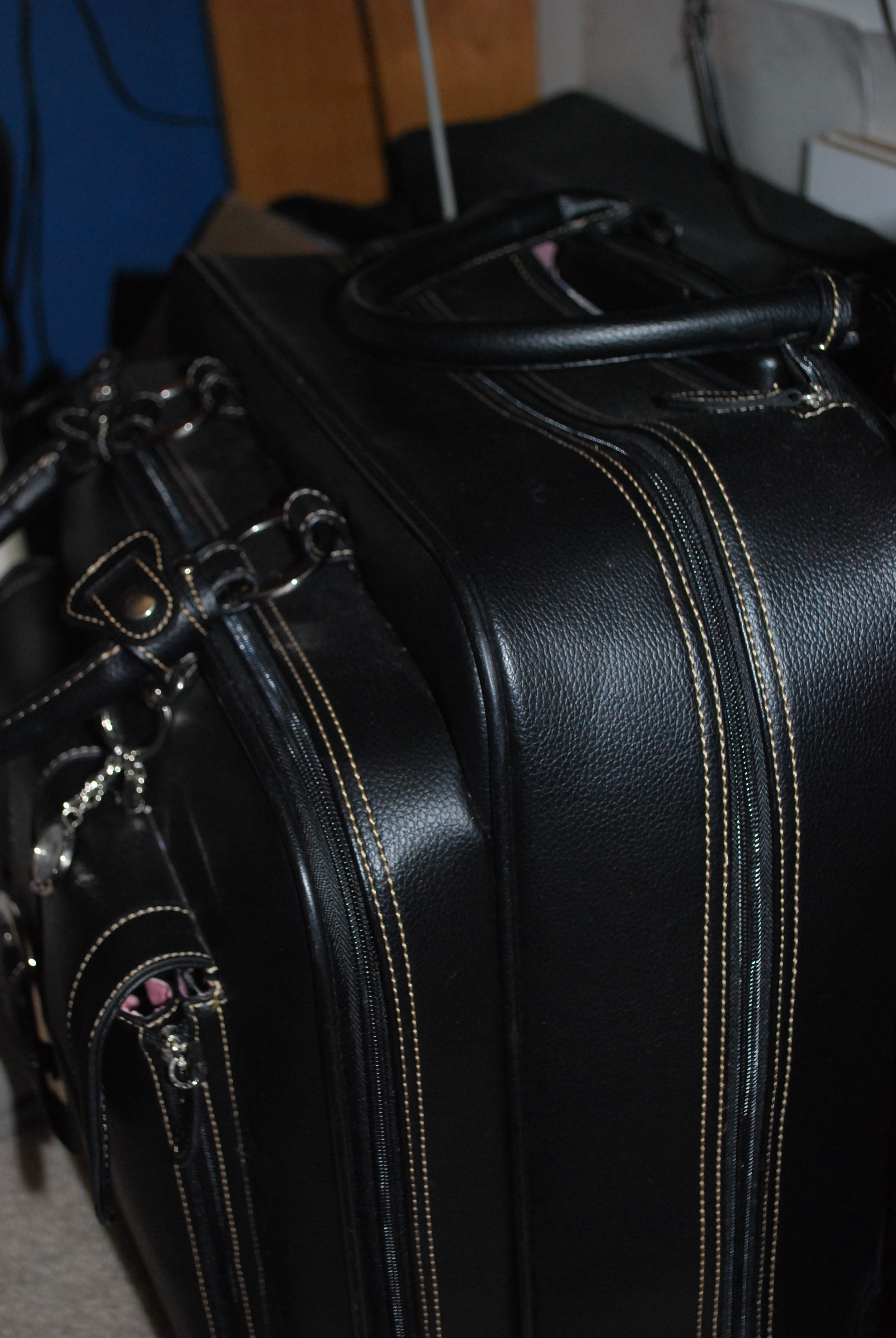 black rolling scrapbook bag stays packed and ready to go (yes, this means that i have double the tools. not the expensive ones, but i do have more than one pair of scissors, one of each Tombow adhesives in both this rolling bag and my little purple tool tote, and 2 paper trimmers)