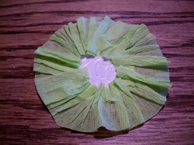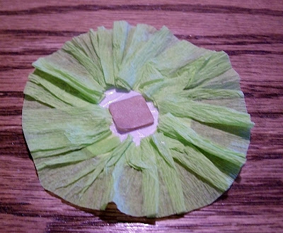 3. Using the element you want for your outside layer, pinch and scrunch and press into the glue. Here I am using crepe paper.