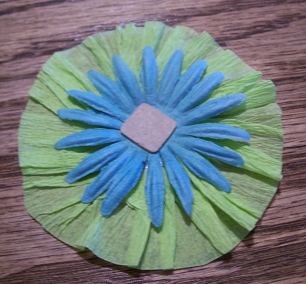 3. Using the element you want for your outside layer, pinch and scrunch and press into the glue. Here I am using crepe paper.