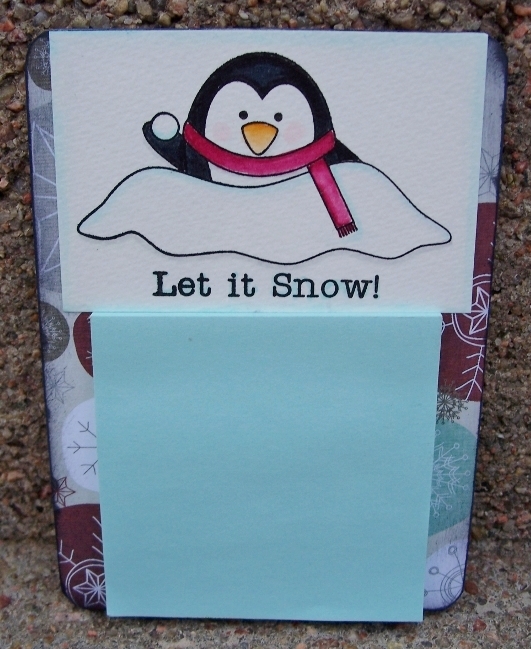 I adhered designer by from Fancy Pants’ Blissful Blizzard line to a chipboard coaster with Mono Glue Stick. The image is stamped on watercolor paper and colored with Dual Brush Pens and adhered to the top of the coaster with Stamp Runner Permanent Adhesive. Add a post it note pad to the front and magnet to the back and you have a fun winter project.