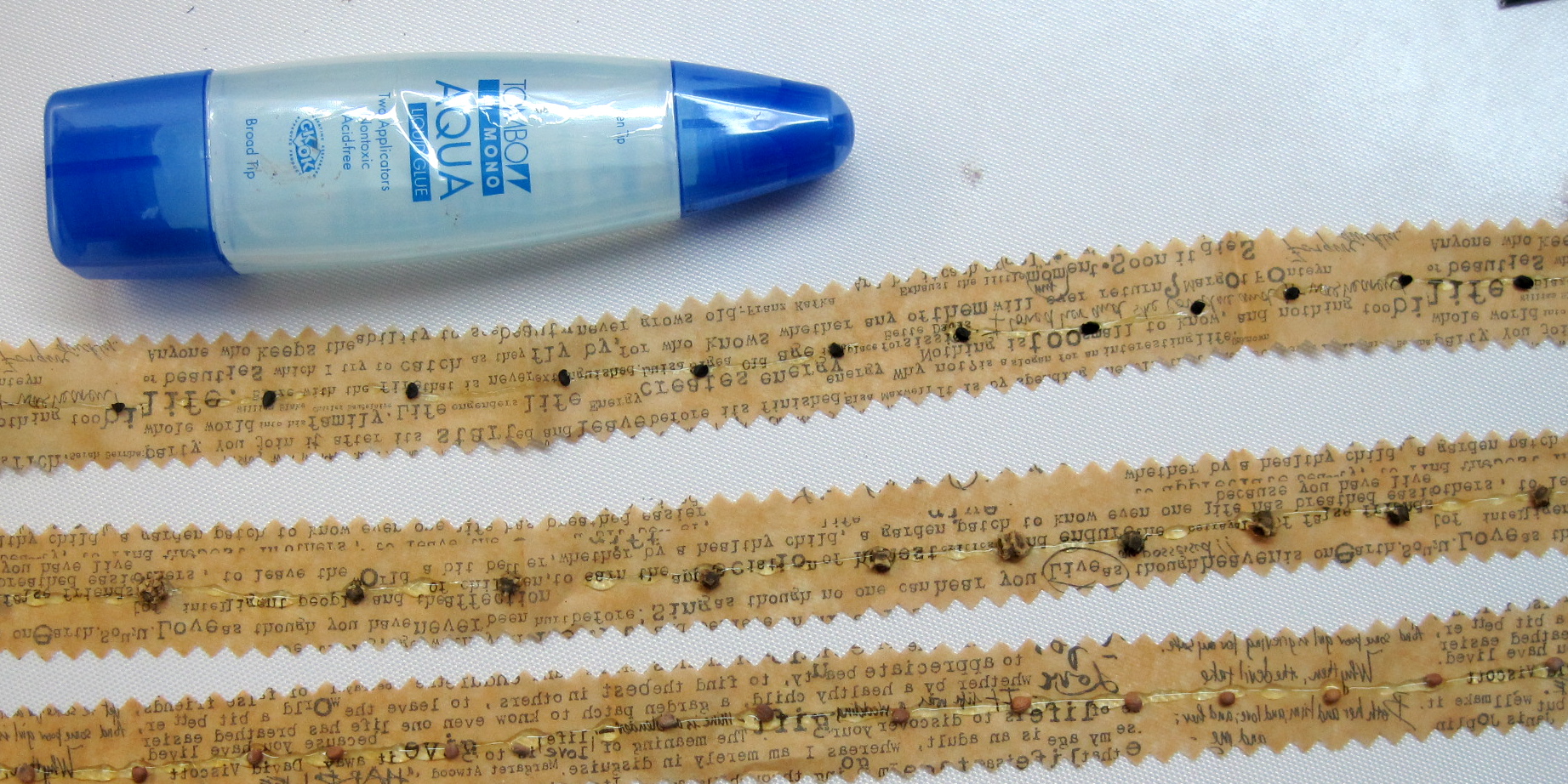 I have always been intrigued by seed tapes; they make planting seeds easy, but are very expensive. I decided to make my own seed tapes and found MONO Aqua the perfect adhesive! Start by using a biodegradable, thin paper like uncolored tissue, newspaper or old sewing patterns. Cut into strips 24″ long.