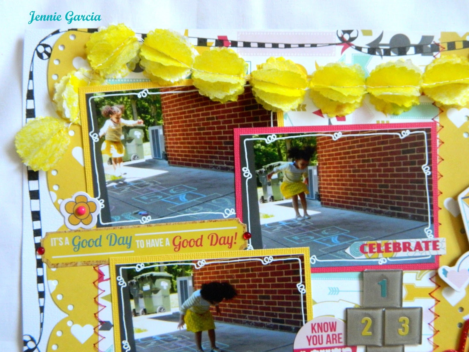 I really wanted to mimic the hopscotch in the photo and I was inspired by the one made with twine but I ended up doing one with the Epiphany Crafts Studio Shape Square Tool, gray cardstock and Fancy Pants numbers. I knew I wanted to do the hopscotch with some craft supply but I wasn’t sure so you don’t have to be too literal with your inspiration.