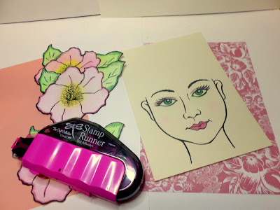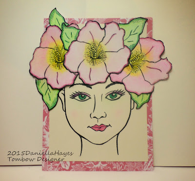 When I was done coloring and buffing, I cut a piece of patterned paper and attached the face to it with the Tombow Stamp Runner Dot Pattern Adhesive. I also used it attach the flowers. I cut some of the leaves off of the flowers and adhered them in different areas too.