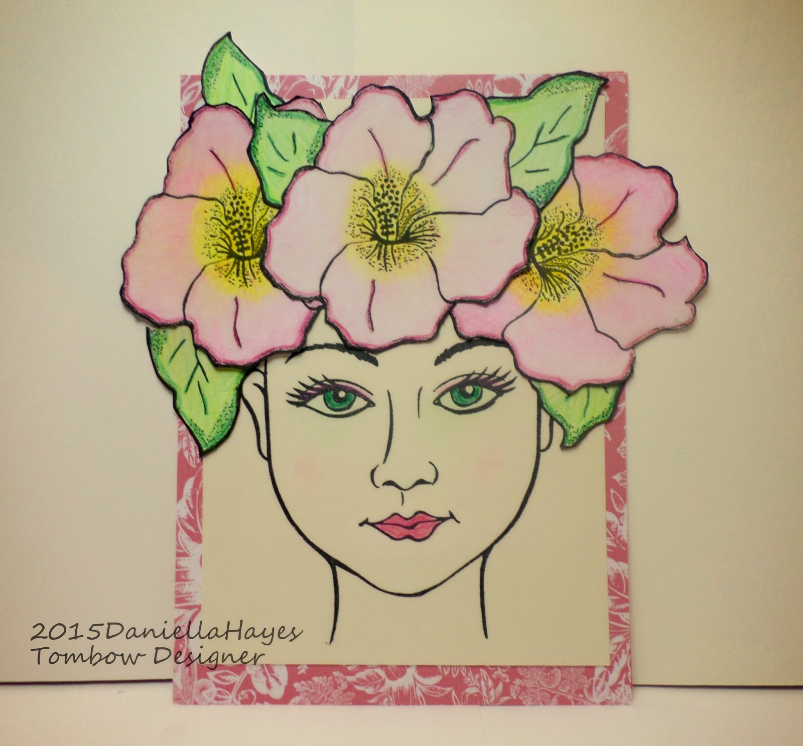 When I was done coloring and buffing, I cut a piece of patterned paper and attached the face to it with the Tombow Stamp Runner Dot Pattern Adhesive. I also used it attach the flowers. I cut some of the leaves off of the flowers and adhered them in different areas too.