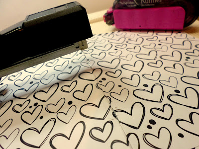I started by cutting several different “Just Add Color” papers. I cut the 3 inside pages to 7″x10″, and the diagonal stripe paper to 7 1/4″ x10 1/4″for the cover. Then I cut the heart paper to 6 3/4″x10 1/4″and adhered it to the top of the diagonal paper with my Tombow Stamp Runner Dot Pattern Adhesive.