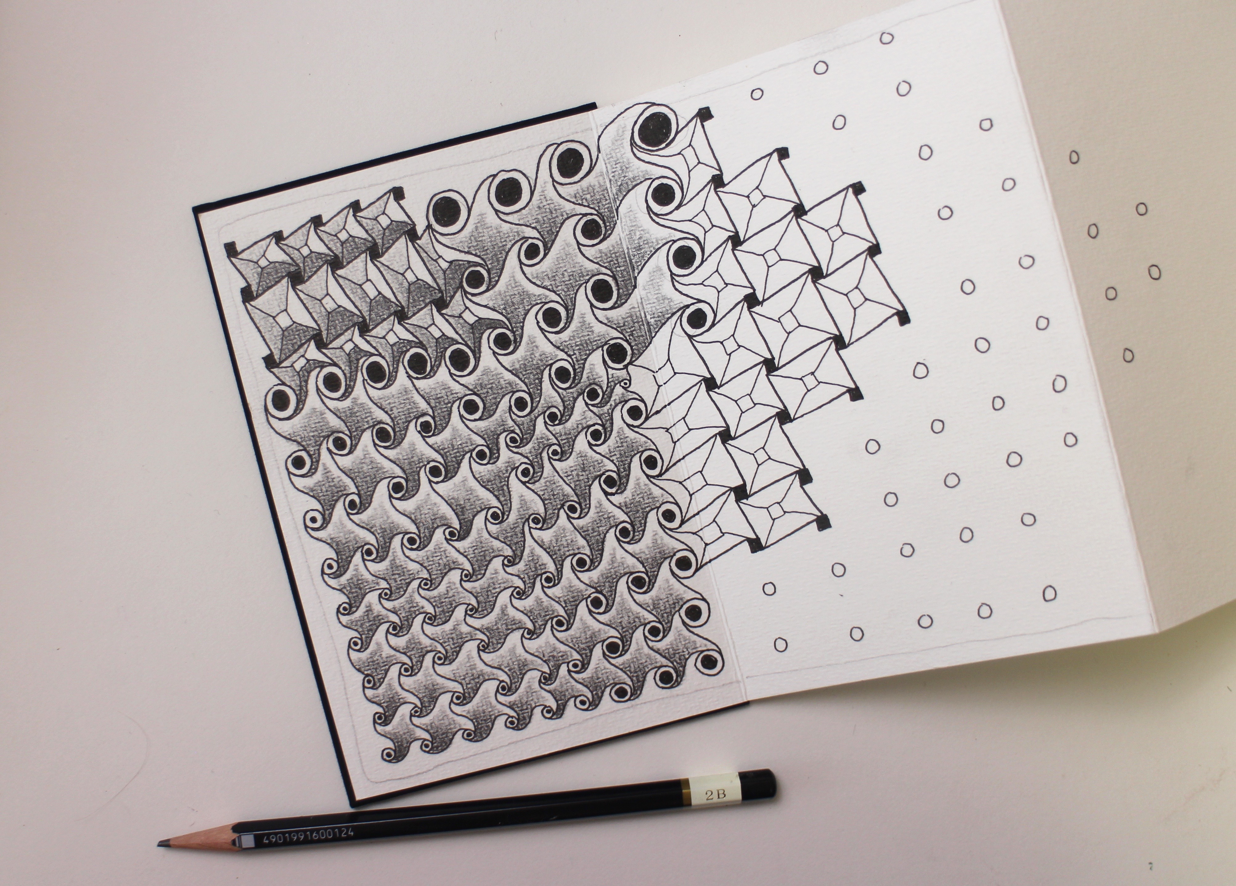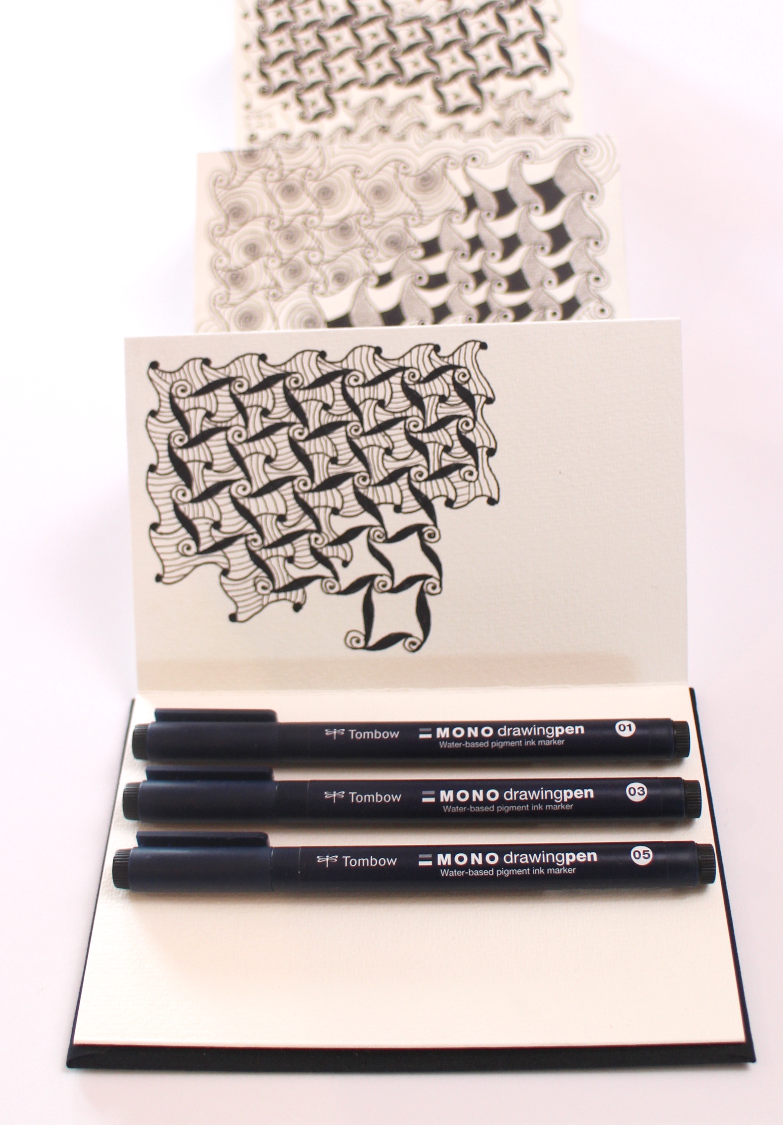 Hi there! It’s Marie Browning, Tombow’s Signature Designer, and I’m excited to share with you why Tombow’s new MONO Drawing Pens are fantastic for Zentangle® Enthusiasts! I am just loving the pens for creating this Zentangle inspired project where I am filling an accordion sketchbook with variations of one tangle. The Cadent Tangle (what a Zentangle pattern is called) is an easy tangle to create variations, or how we say in Zentangle speak, Tanglelations.