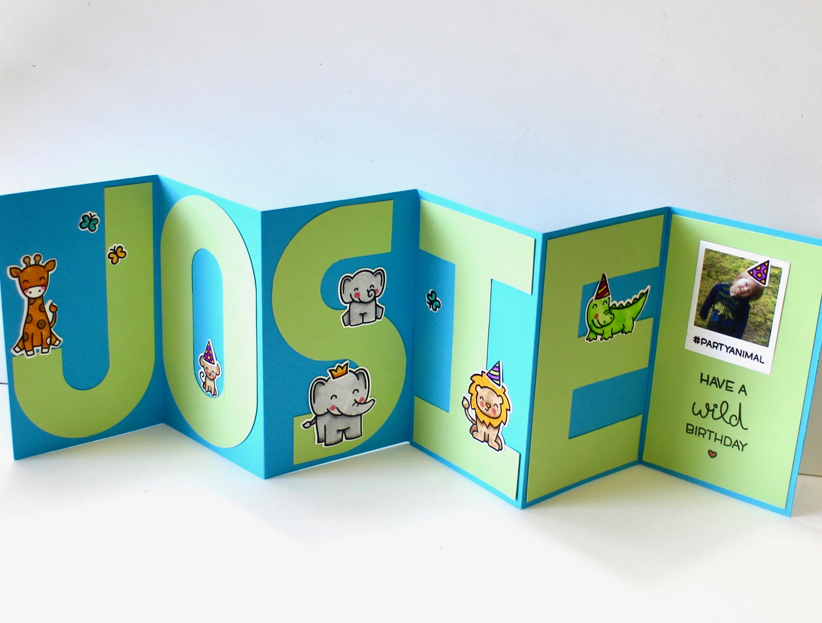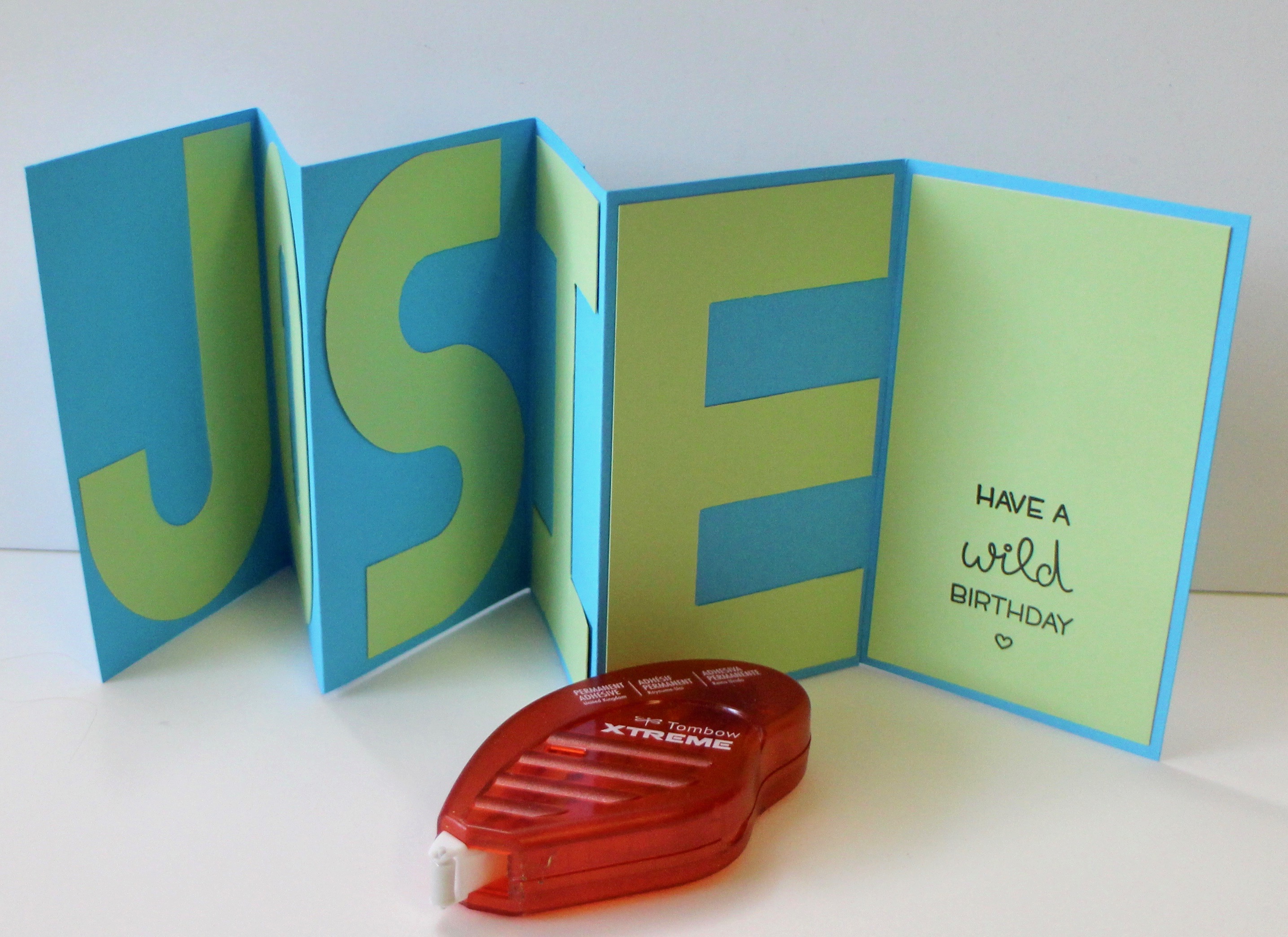 It’s Marie Browning here today to show you how to create a fun accordion card using Lawn Fawn and Tombow products! I had lots of fun creating this card for Josie! Use any child’s name – just add or subtract the number of panels from the accordion fold!