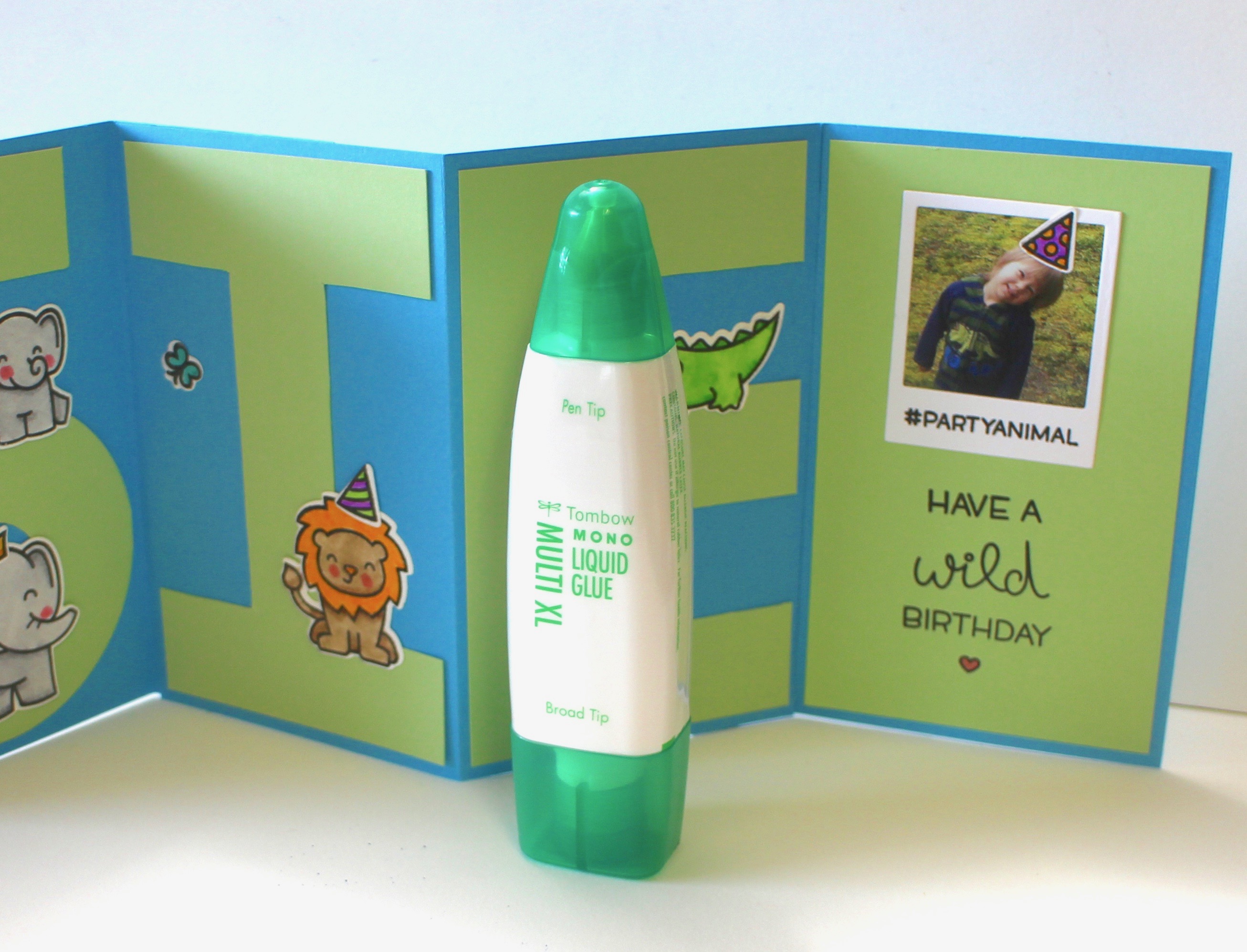 To adhere the critters into place, I used the MONO Multi XL Liquid Glue. The new large size of the MONO Multi Glue goes a long way as you need only a tiny bit for each motif to hold them strongly in place. For the end panel I used the Say Cheese Again custom craft die to cut out the photo frame. i glued in a photo of Josie and added the stamping using the Wild for You Stamp Set.