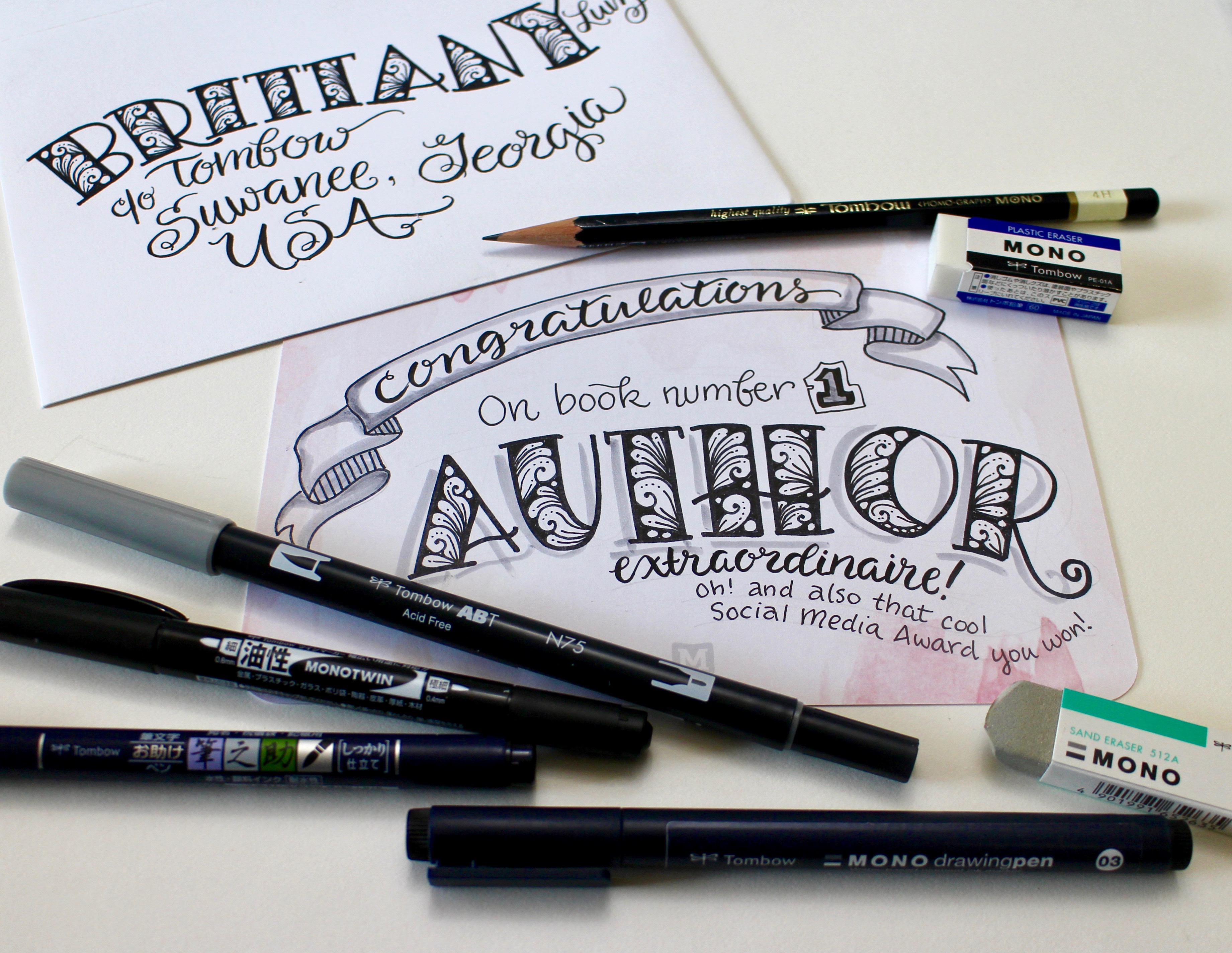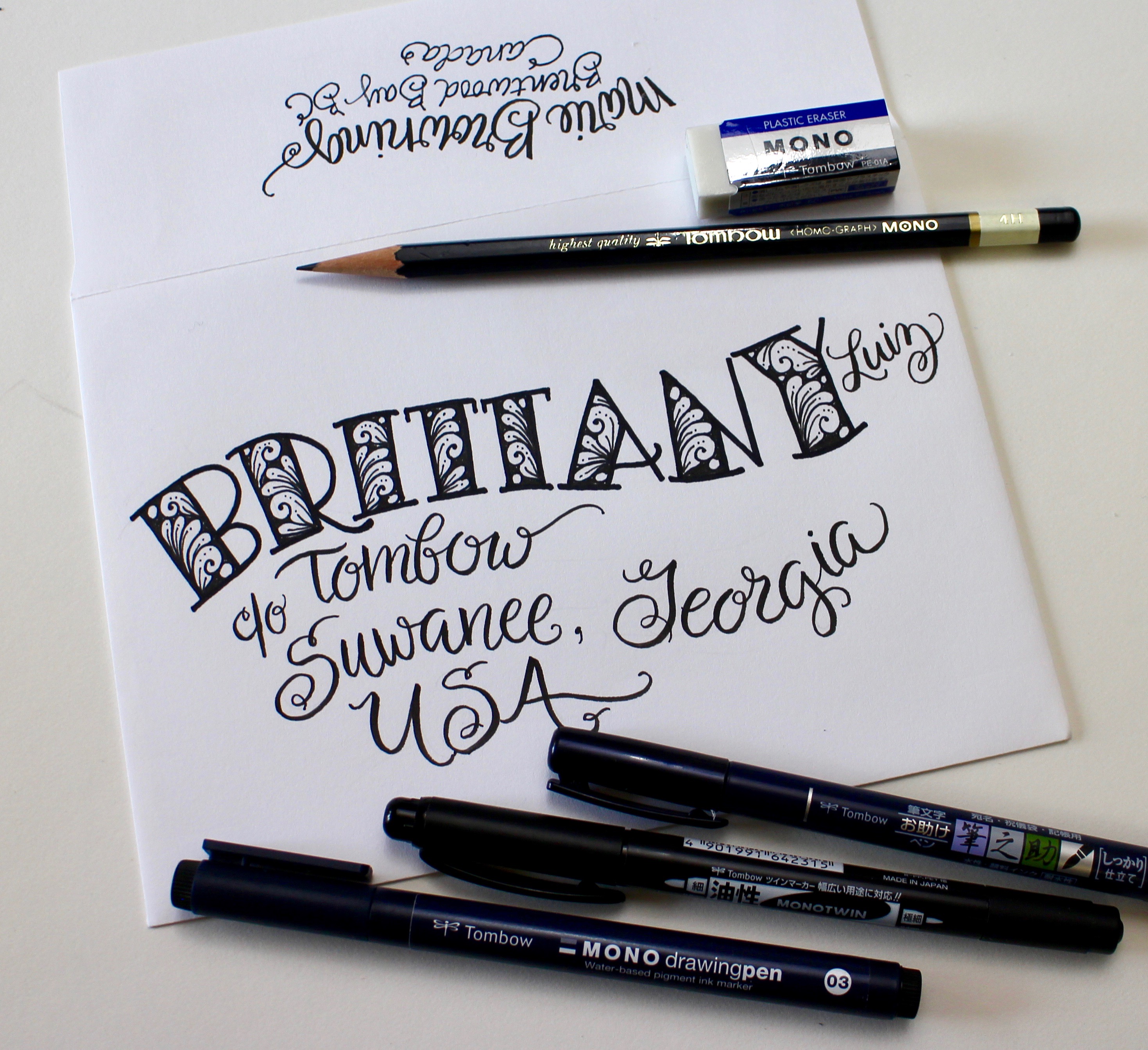 After I sketched in my lettering, I used the MONO Twin Permanent Marker (also in the Beginner Lettering Set) for ‘Brittany’. This fat filler font is easy and so much fun to fill in with different patterns! (Click here to see complete instructions for the Fat Filler Font) I used the large bullet tip for outlining the letters and the fine tip for the design inside the letters. I also use the 03 MONO Drawing Pen for the small details. For the brush lettering I used the Hard Tip Fudenosuke from the lettering set.