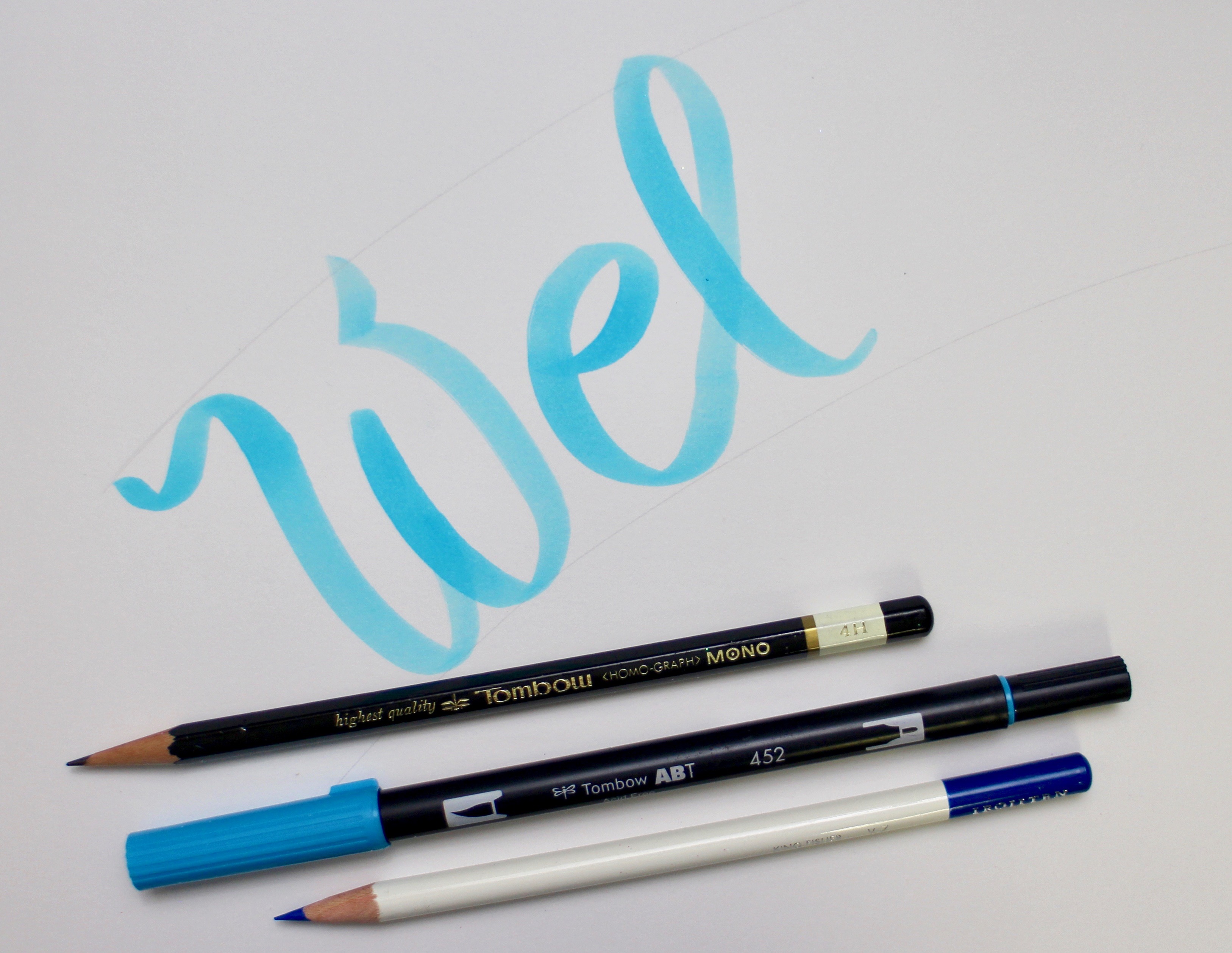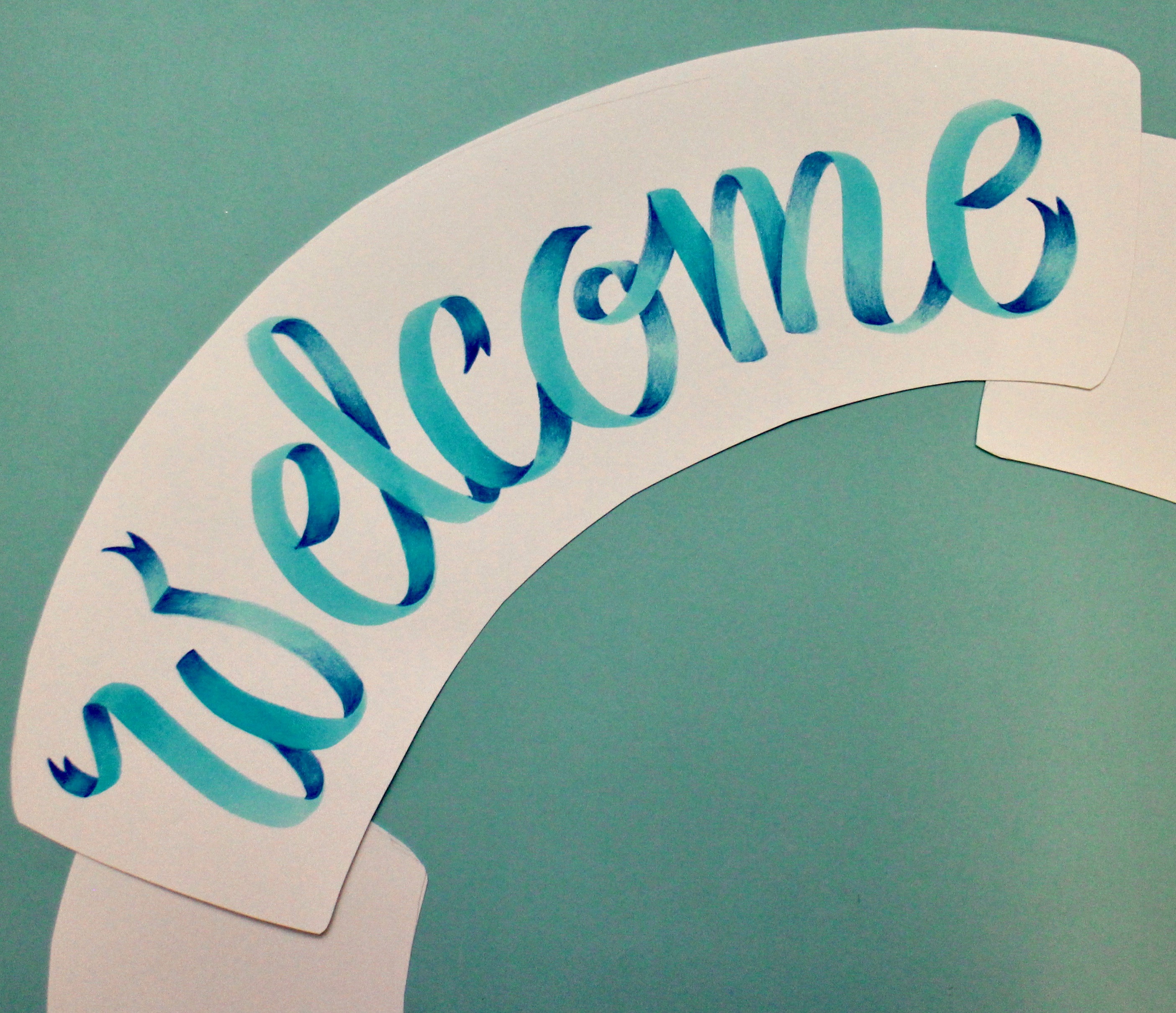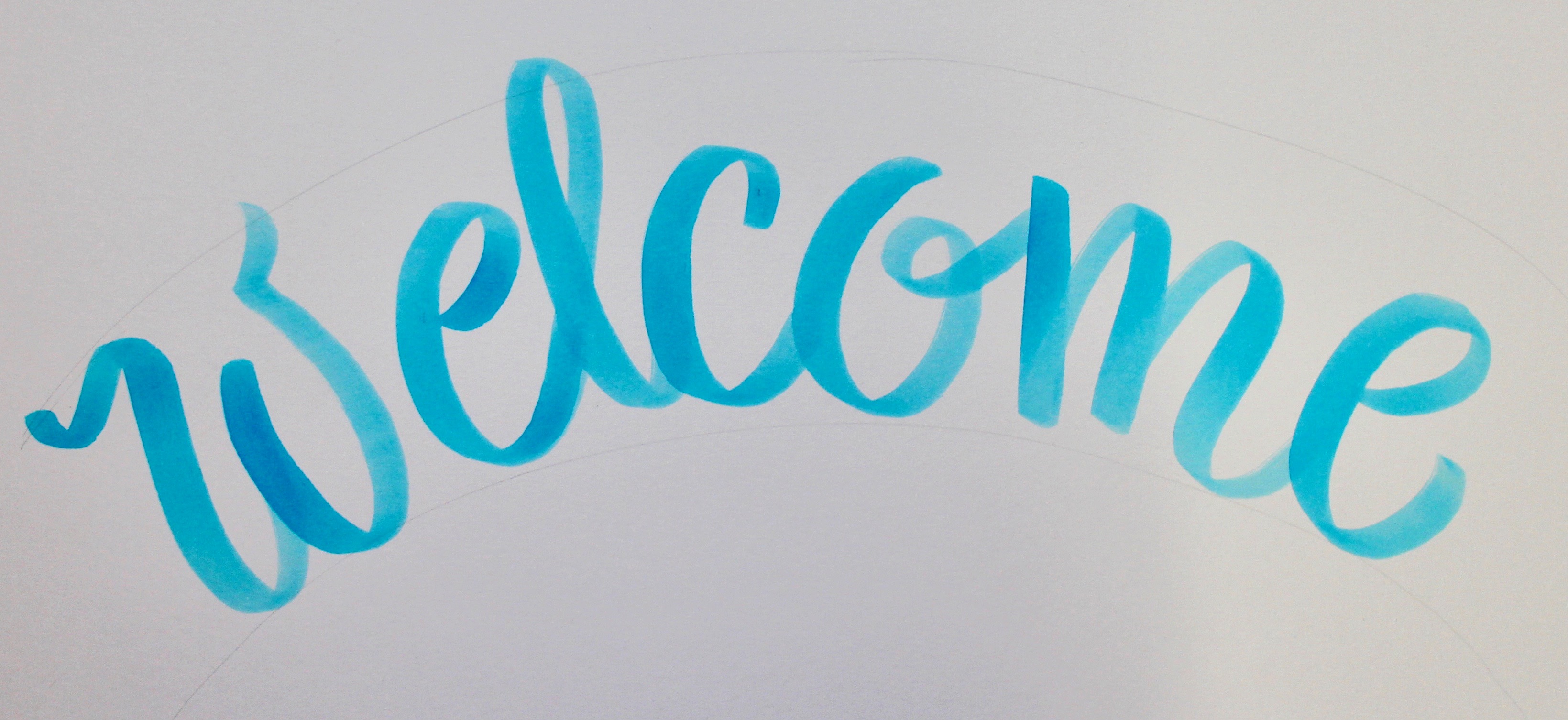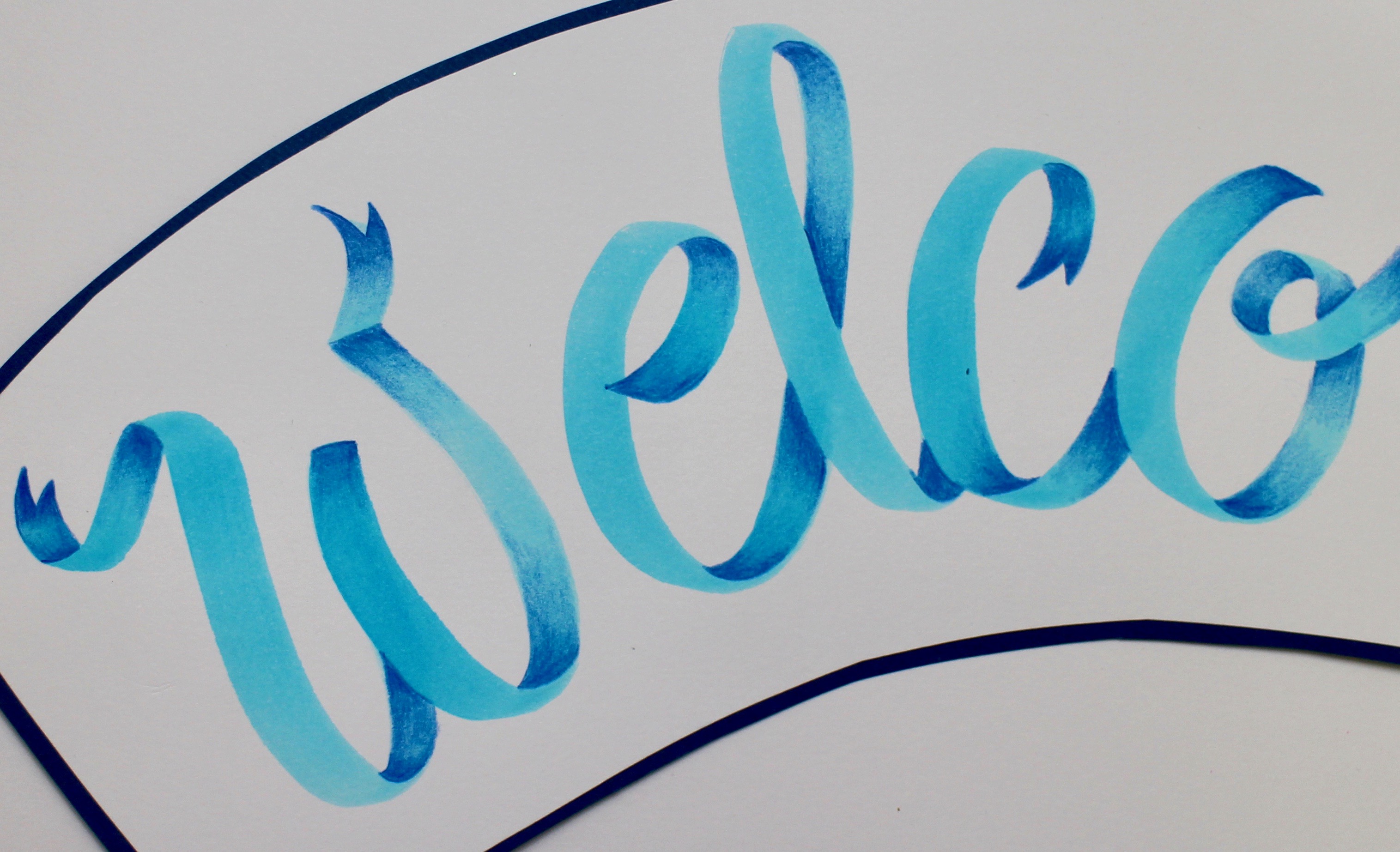 Start with a 4H MONO Drawing Pencil to mark your guidelines on a large sheet of mix media or Bristol paper. The letters should be about 3″ high. Use the 452 Process Blue Dual Brush Pen and with the brush tip, write WELCOME. For the ribbon lettering, you do not need to worry about making thin lines, keep the pressure hard for the entire word to create thick, large letters.