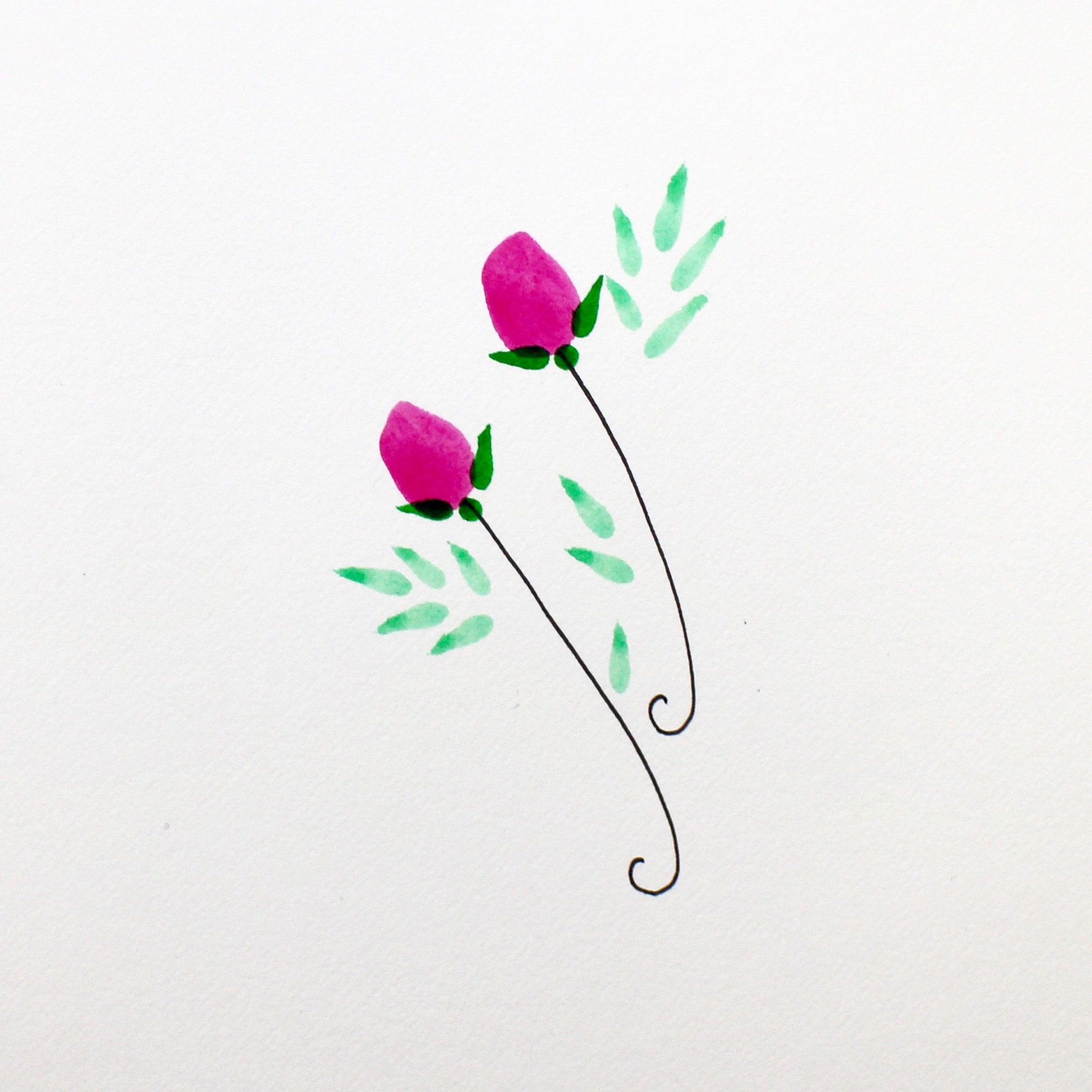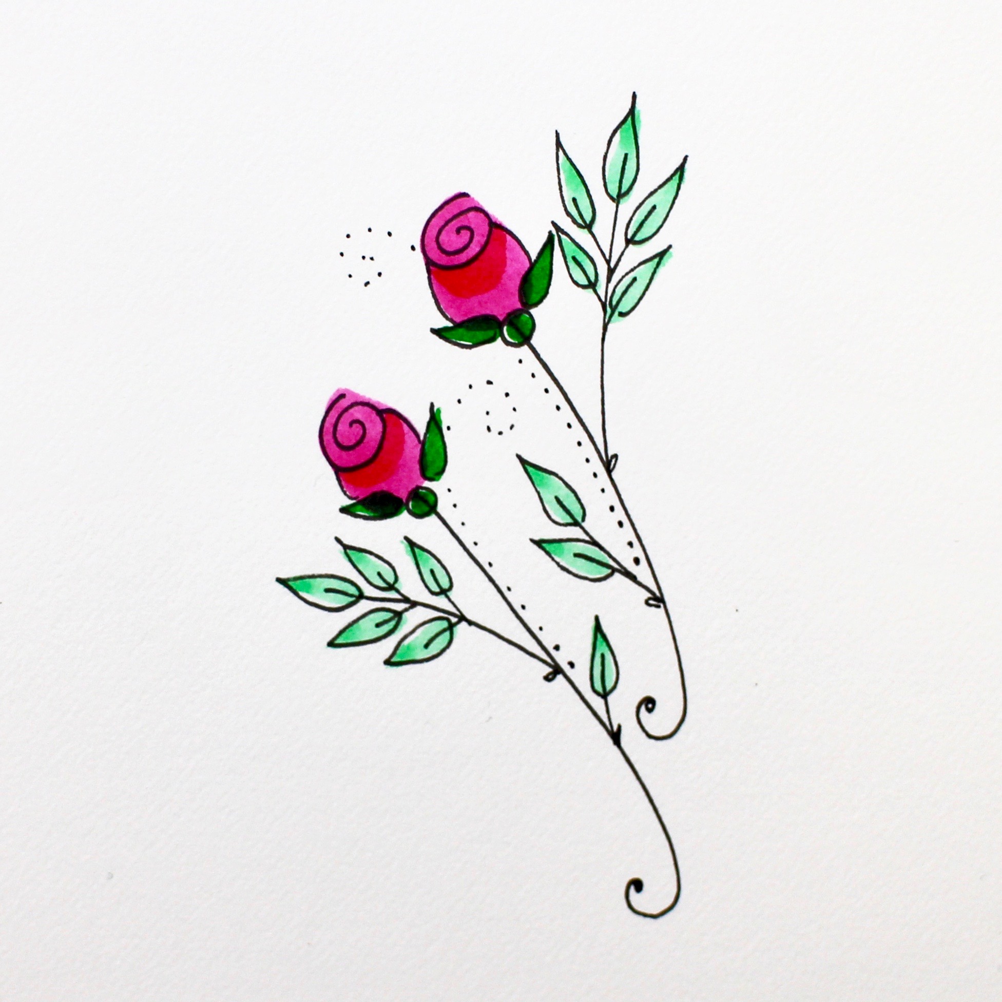 - Add the stems using the MONO Drawing Pen. It helps to place the leaves. With the 245 Sap Green Dual Brush Pen, add the calyx and side petals at the base of the rose blooms. Draw the round calyx using the fine tip of the brush pen. The side petals are just ‘dabbed’ lightly with the point of the brush tip to form the leaf shapes. With the 243 Mint Dual Brush Pen, use the brush tip and the ‘dabbing’ method to add the leaves. Use heavy pressure this time to make the leaves large.