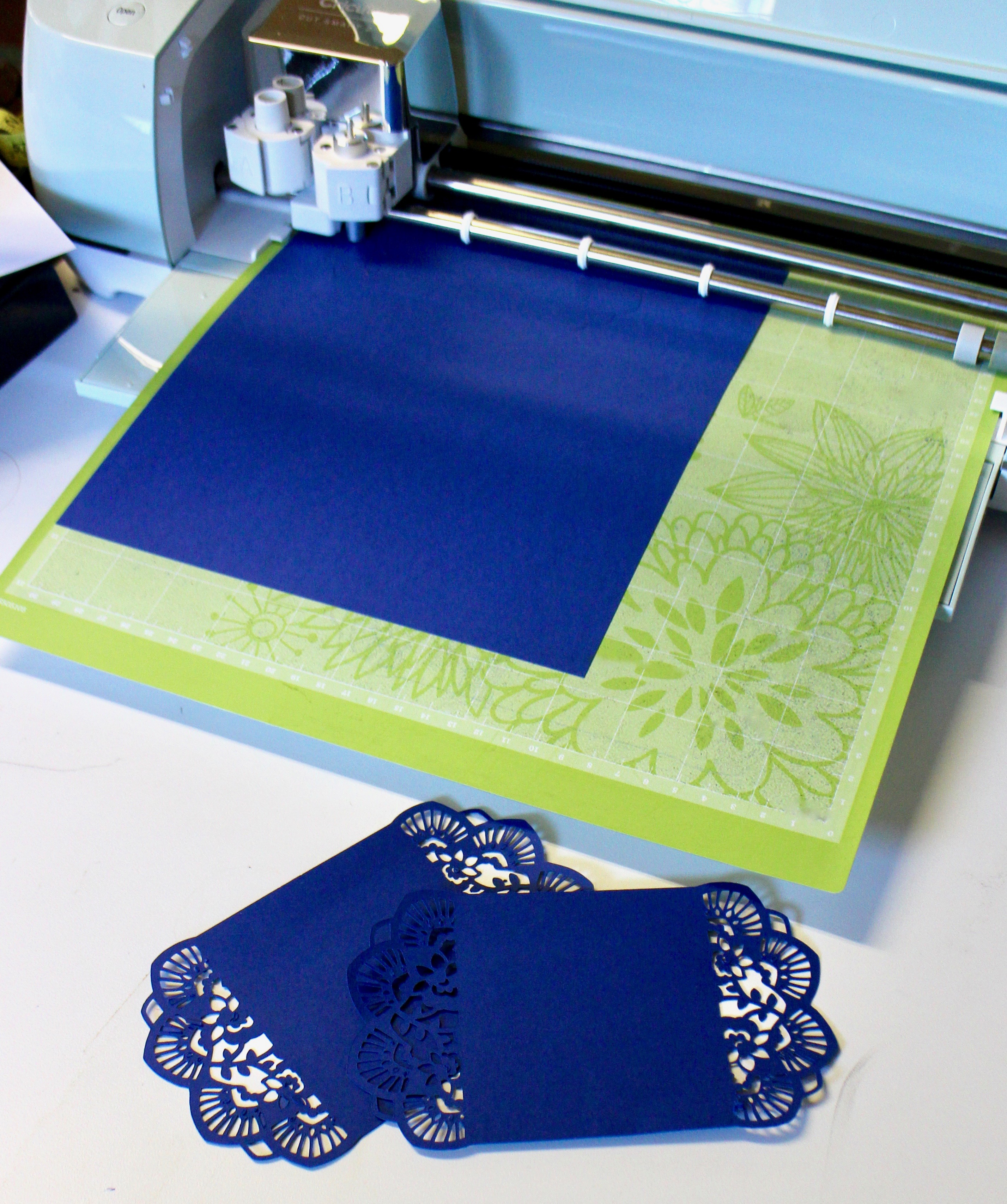Using the Cricut Explore Air 2 and a beautiful template from the Cricut Design Space, it was quick and easy to cut out the filigree design. This is the same design used for the wedding invitation, and it was easy to customize into place cards. After they were finished cutting, they were cut in half.
