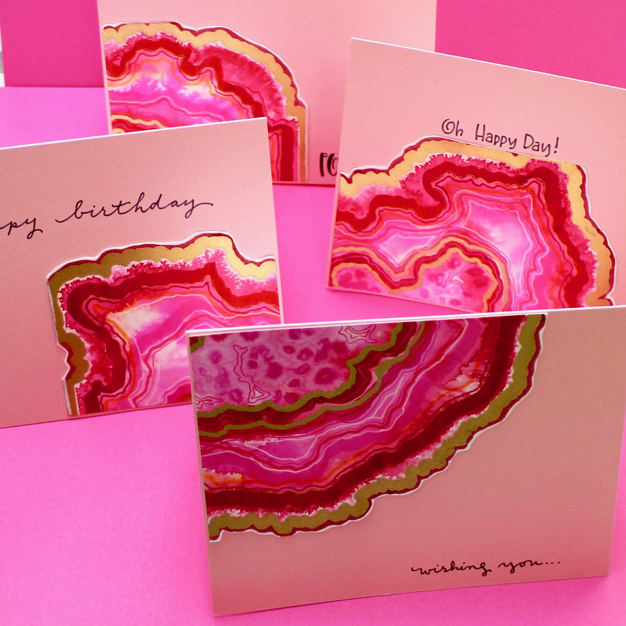 To make the cards, cut the pink agate slice into quarters using straight lines. You can quickly make a bundle of cards as one agate slice makes four cards! Trim the edge of the agate pieces leaving a slight white edge. At this time, I used the 837 Dual Brush Pen to edge the agate slice on the paper edges. Adhere the cut piece of the agates into the corner or edges of a pink card blank using Tombow Xtreme Adhesive. Use the MONO Twin Marker or Fudenosuke Brush Pen to add sentiments to the card front.