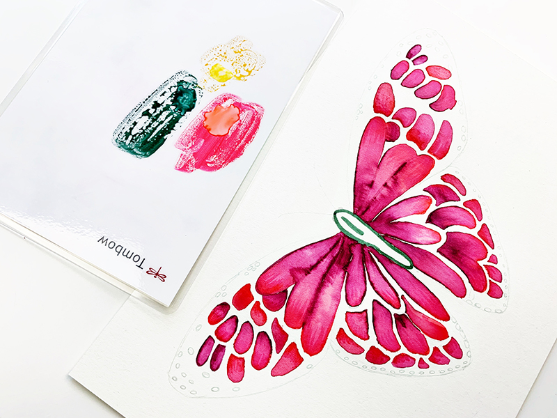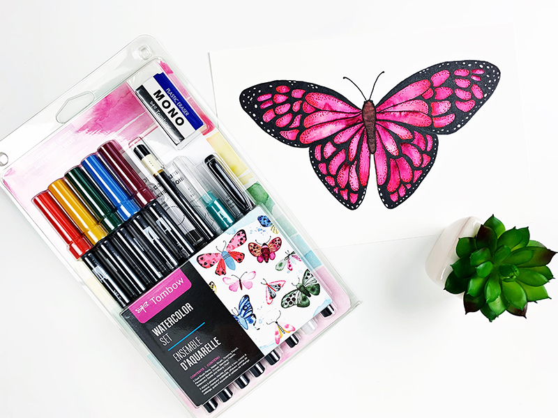 Hey Tombow friends! This is Jennie and today I’ll show you how to make a simple butterfly using the Tombow Watercolor Set. This set comes with an insert that has awesome tips and tricks for watercoloring. You can also find many videos and books! I recommend this book by Peggy Dean! It has simple and intermediate images you can recreate!