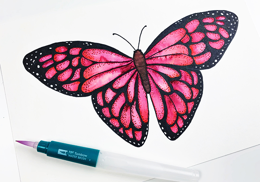 Add small details. Details are great for floral and fauna. I used the fine tip of the Tombow Dual Brush Pens to add dots the butterfly wings. To the thorax, I added lines with color I picked up from the Tombow Blending Palette using the Tombow Medium Water Brush. A second option is to use the Medium Water Brush to blend the dots slightly. You also have the option of leaving the details out.