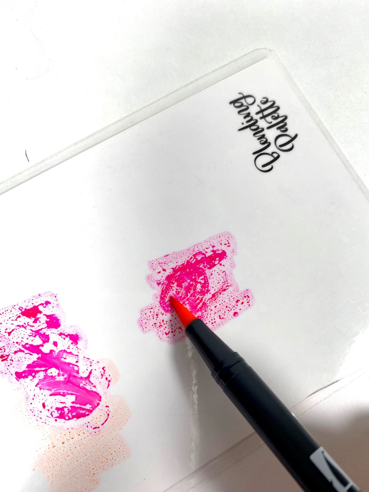 Scribble ink from two different Dual Brush Pens directly onto the Blending Palette. I used Dual Brush Pens 725 and 873 below. Use Dual Brush Pen 873 to pick up Dual Brush Pen 725 getting as much ink on the tip of 873 as you can. Then letter out your word.