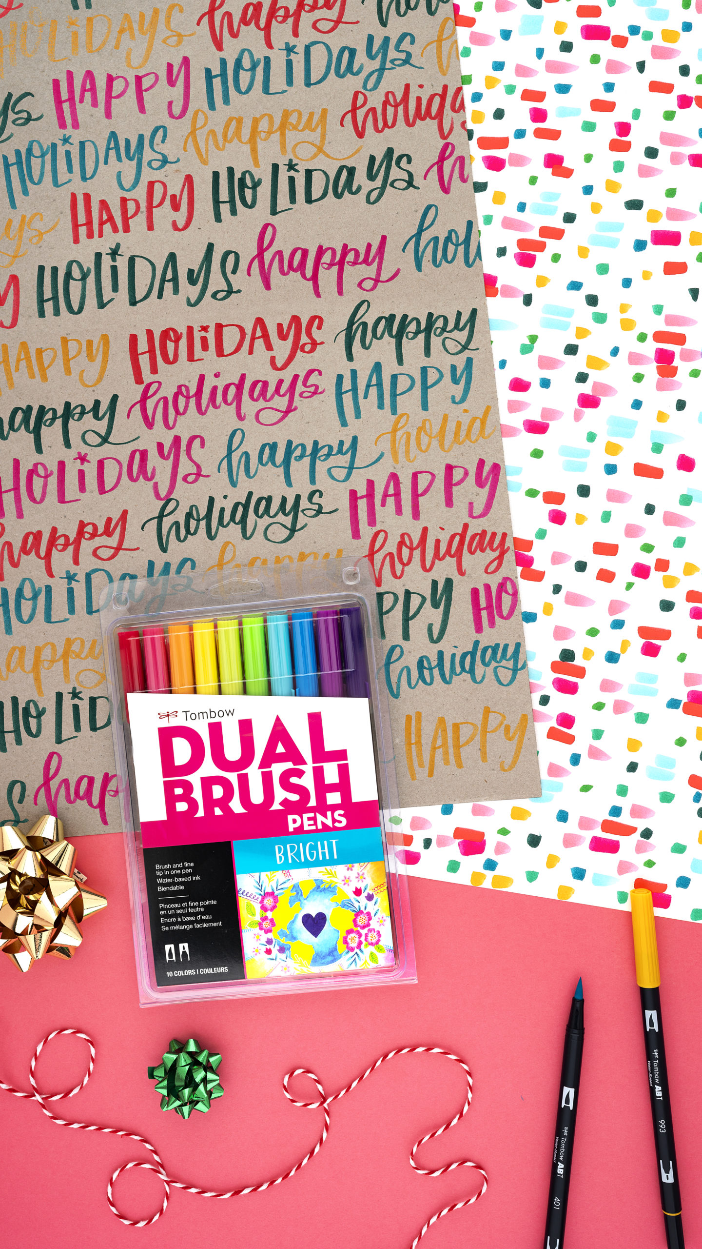 Make your own one-of-a-kind handmade wrapping paper this year with our Dual Brush Pens! Grab your favorite colors and a roll of white or kraft paper and draw or hand letter your very own design. Mix it up by using both the brush tip and the bullet tip. Here are a few examples below for inspiration – and you can find more on our Holiday Crafts Pinterest Board!