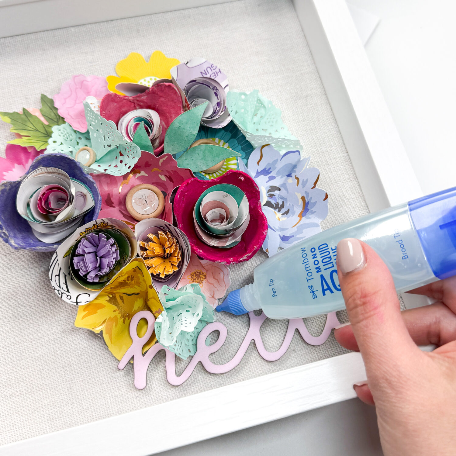 Most of these flowers started life as egg cartons and scraps! I colored the petals with Dual Brush Pen Art Markers, mixing shades right on the paper for painterly variation, then secured everything inside a shadow box with MONO Aqua Liquid Glue. It’s thrifty, dimensional, and such a satisfying way to turn recyclables into home décor.