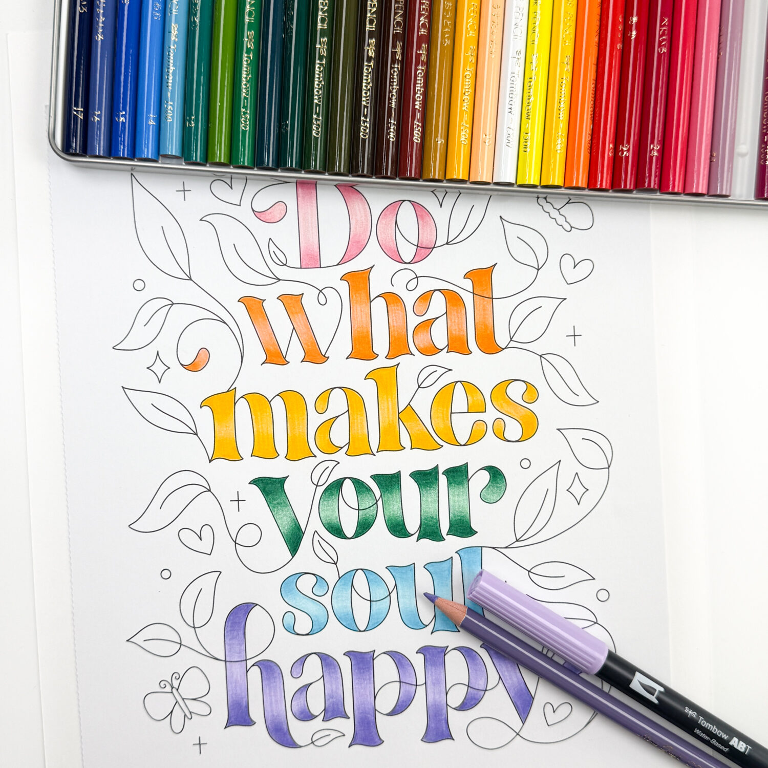 I loved slowing down with a positive reminder. I blended 1500 Series Colored Pencils for buttery gradients and used Dual Brush Pen Art Markers to punch up the brights. The combo gives crisp edges with pencil softness—perfect for big statement lettering.