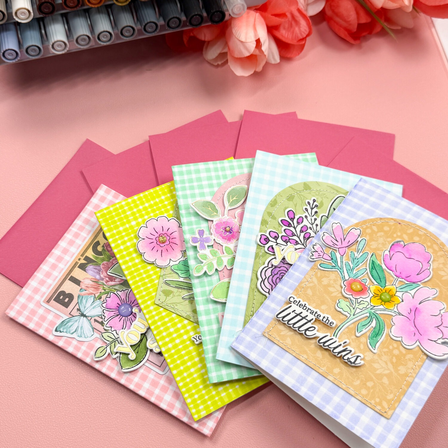 This little suite of cards began with Dual Brush Pen Art Markers—I drew quick lines to build gingham backgrounds, then used the same pens as watercolors to paint stamped florals. One palette, two techniques, coordinated everything.