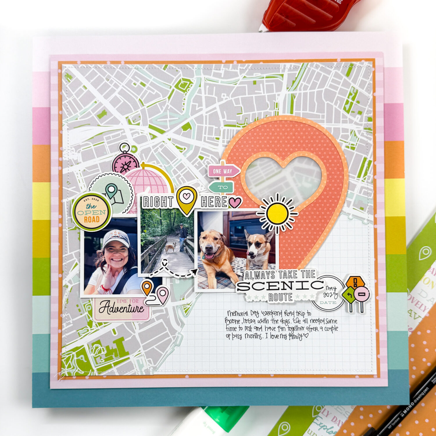 For this map-themed page, MONO Multi Glue and the Xtreme Adhesive Tape Runner teamed up to hold every layer (and chipboard!) flat and secure. I finished the story with handwritten notes using a MONO Drawing Pen Color—water-based pigment ink that stays crisp over photos and paper.