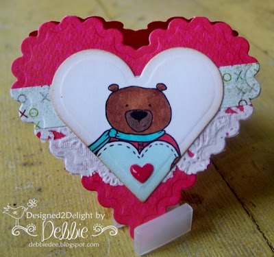 I colored the Be Mine Bear and also colored a paper doily to match (the white was too much white). I love that I had some vintage rayon seam binding to match as well!