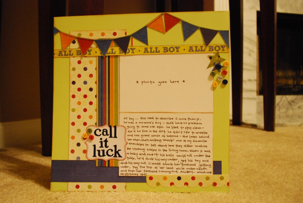 here is a layout i put together to document my children’s sense of balance or lack there of. it is a funny anecdote that i like to share about the stacking tables in my living room, so i thought i had better put it into my scrapbook so i will always have it, because it may not stay this way…for better or for worse. (now to search for the perfect picture to go with it!)
