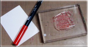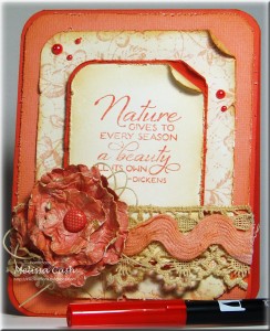 Hi there! This week our theme is “What’s New”. Each year Pantone comes out with the new “in” color for the year and for 2012 it is Tangerine Tango. Today I am going to share a card with you that I created using a monochromatic color scheme and a pretty little flower. I used the Tombow Stamp Runner-Permanent Adhesive , Tombow Power Tabs and Dual Brush Pen #885 (Warm Red).