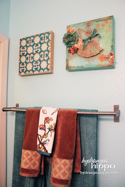I received some gorgeous White on Kraft Damask CCP2722 patterned paper from Canvas Corp as well as a premade canvas flower. I gathered paints, inks, and other embellies to match the colors of my bathroom and went to town.