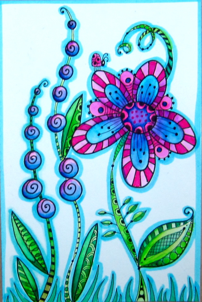 Coming up at the Tangle U in Northampton I will be introducing glorious color to my fellow Zentangle teachers. They will be transforming a fun Zentangle inspired garden of flowers and critters from black and white to amazing colors using the Tombow Dual Brush Pens. Color comes as a challenge to many and I like to teach it in a fun and no-stress atmosphere that encourages you to develop your own style.
