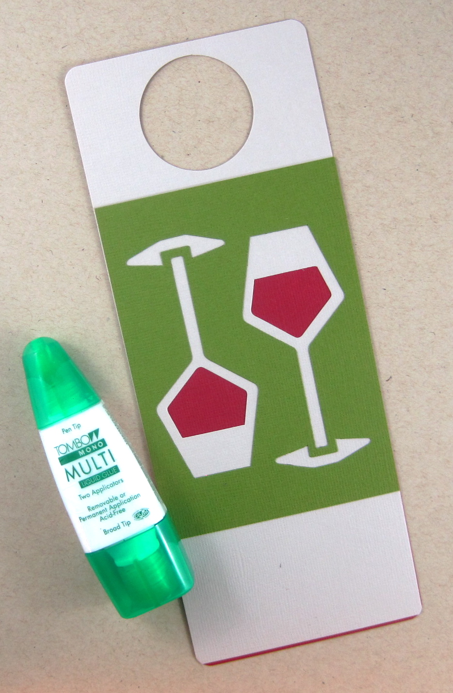 I kept the ‘negative’ pieces from the wine tag and when I got home, I created another tag using some decorative cardstock. When I went to cut the pieces using a craft knife and cutting board, I found Removable Adhesive very helpful to position the paper temporarily. It prevented the paper from slipping while cutting and the glue was easily removed by rubbing off with my finger and leaving no residue.