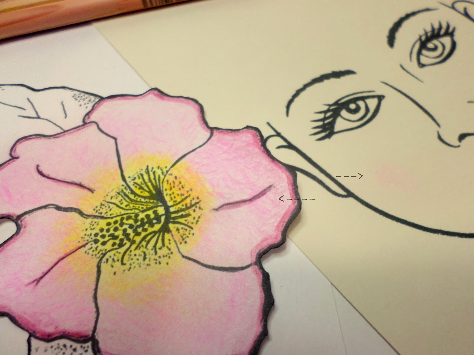 I also colored a little bit of pink pencil on the cheeks of the face. There is no way to do that without leaving some circular marks. In the picture above, I pointed out the cheek color and the lines in the flower. No matter how hard I try, there are always some marks. And I have a solution! Use a paper towel and “buff” you coloring!