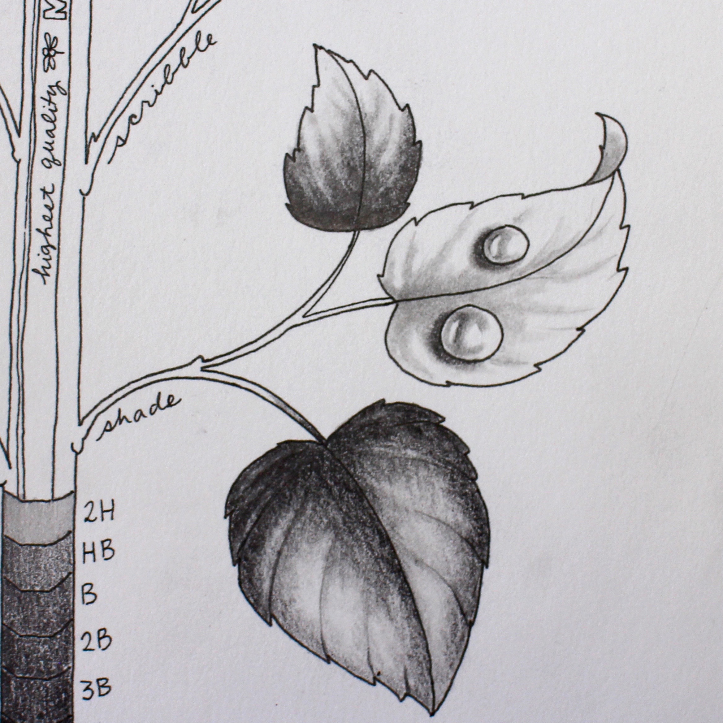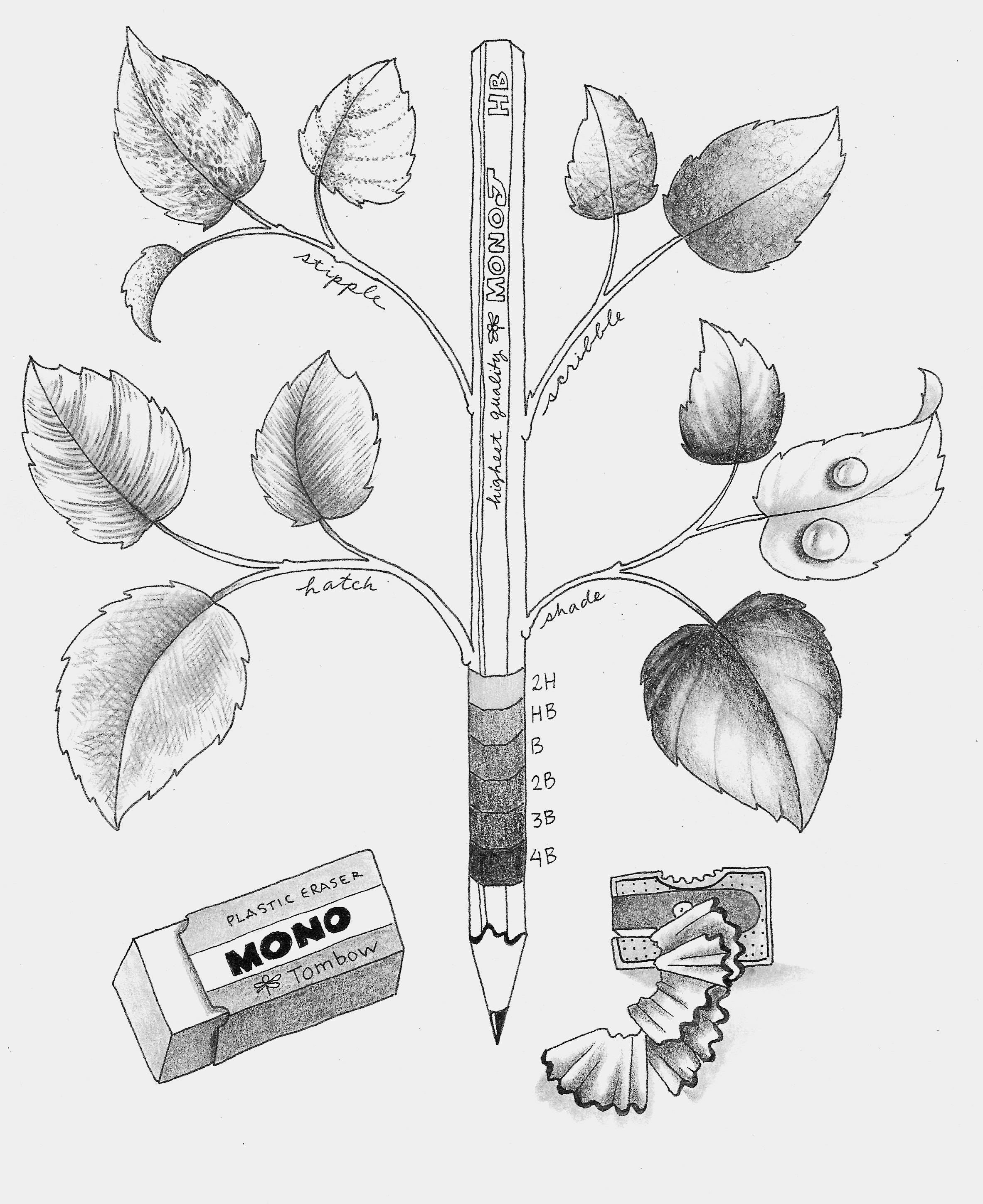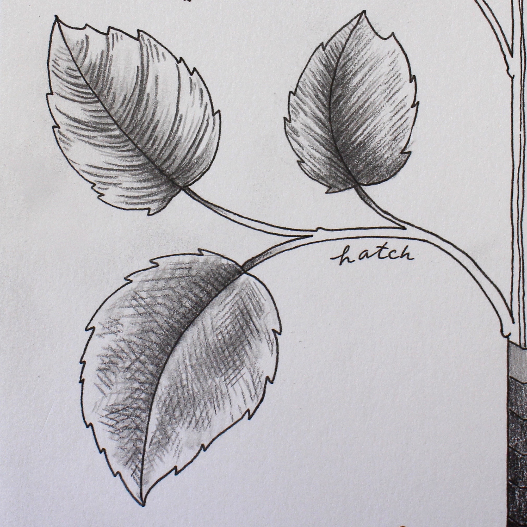 Draw like a master when you use hatching! The 2B, B and HB MONO J pencil grades work well for this method. The small leaf used hatching; parallel penciled lines to create the shading. The middle leaf used curved lines for this contour hatched example. The large bottom leaf uses cross hatching to create the effect.