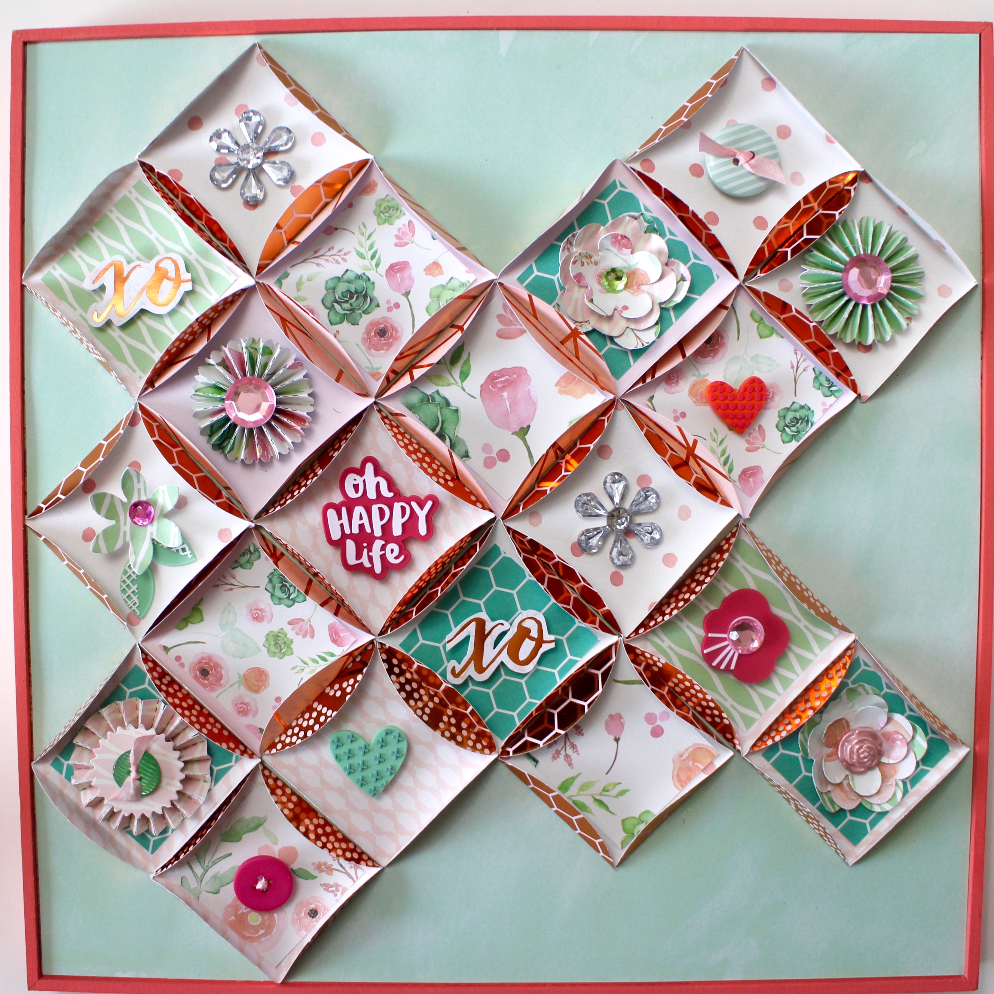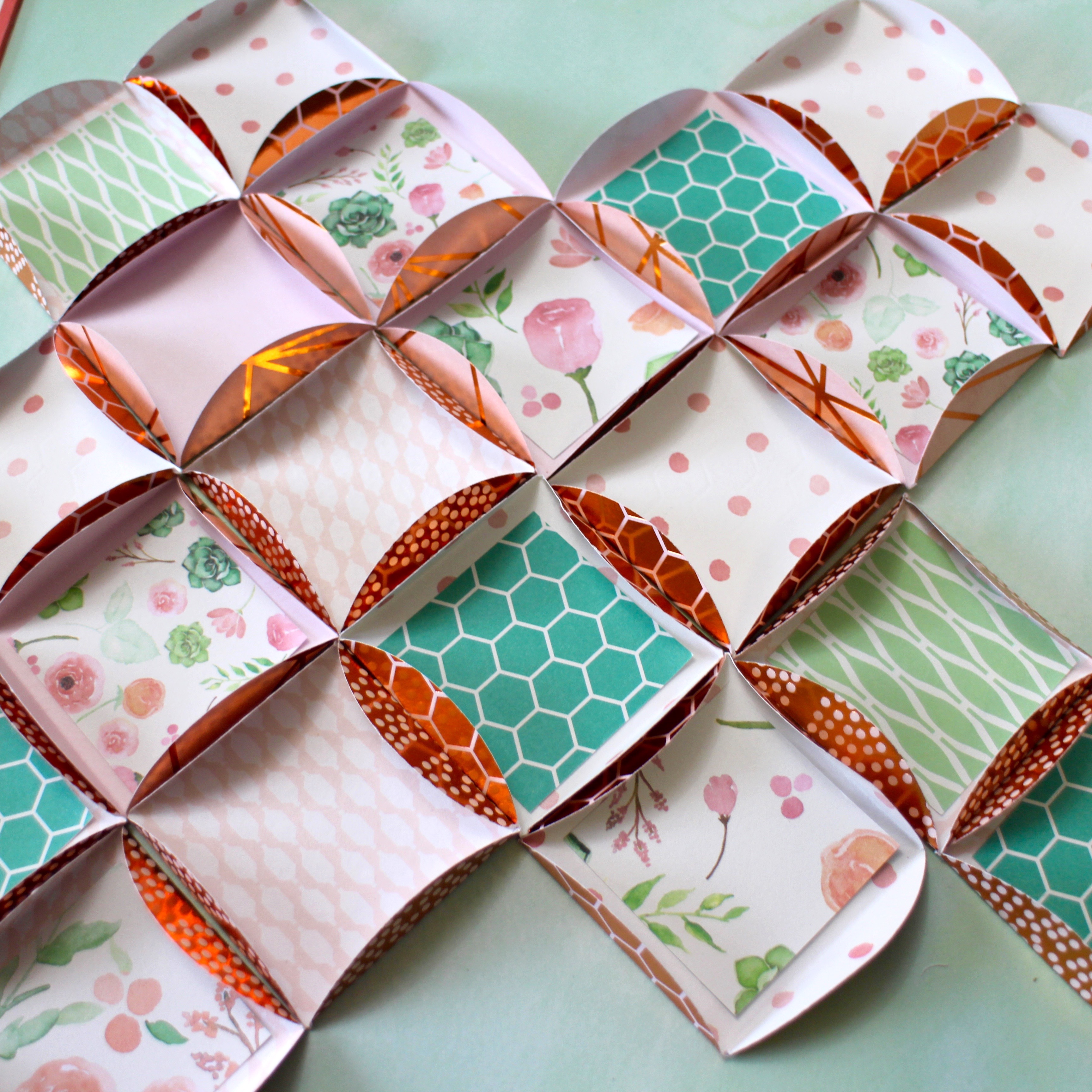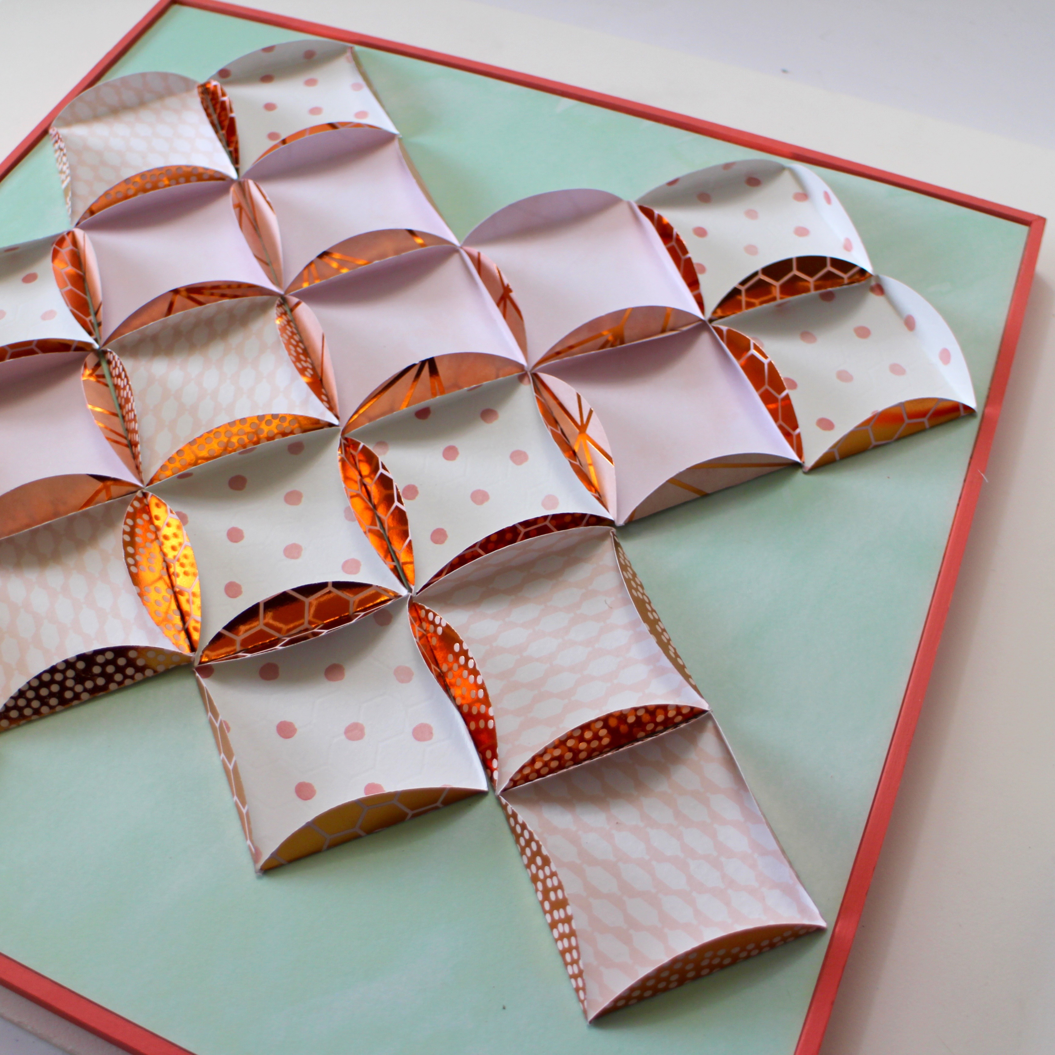 Using a scrap piece of paper, cut a 2″ square to use as a template. Use the MONO Removable Adhesive and place the template into the circle. Fold in the circle edges and press down with a bone folder. Repeat with all the paper circles using the template as your folding guide. When all your circles are done, attach them into the frame using the MONO Adhesive+. For this design, all the edges were the copper foil side.
