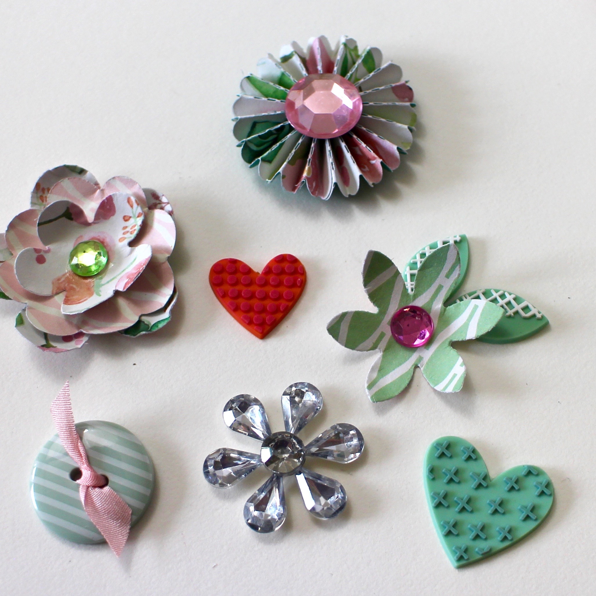 Create rosettes, paper flowers and be-ribboned buttons. The rosettes and paper flowers are constructed from the Copper Luxury Paper Pad using MONO Multi Liquid Glue and Tombow Xtreme Tabs. Look through your embellishments and discover other pieces, such as rhinestones and buttons that will match your color theme. I also used rubber shape embellishments from Amy Tangerine.