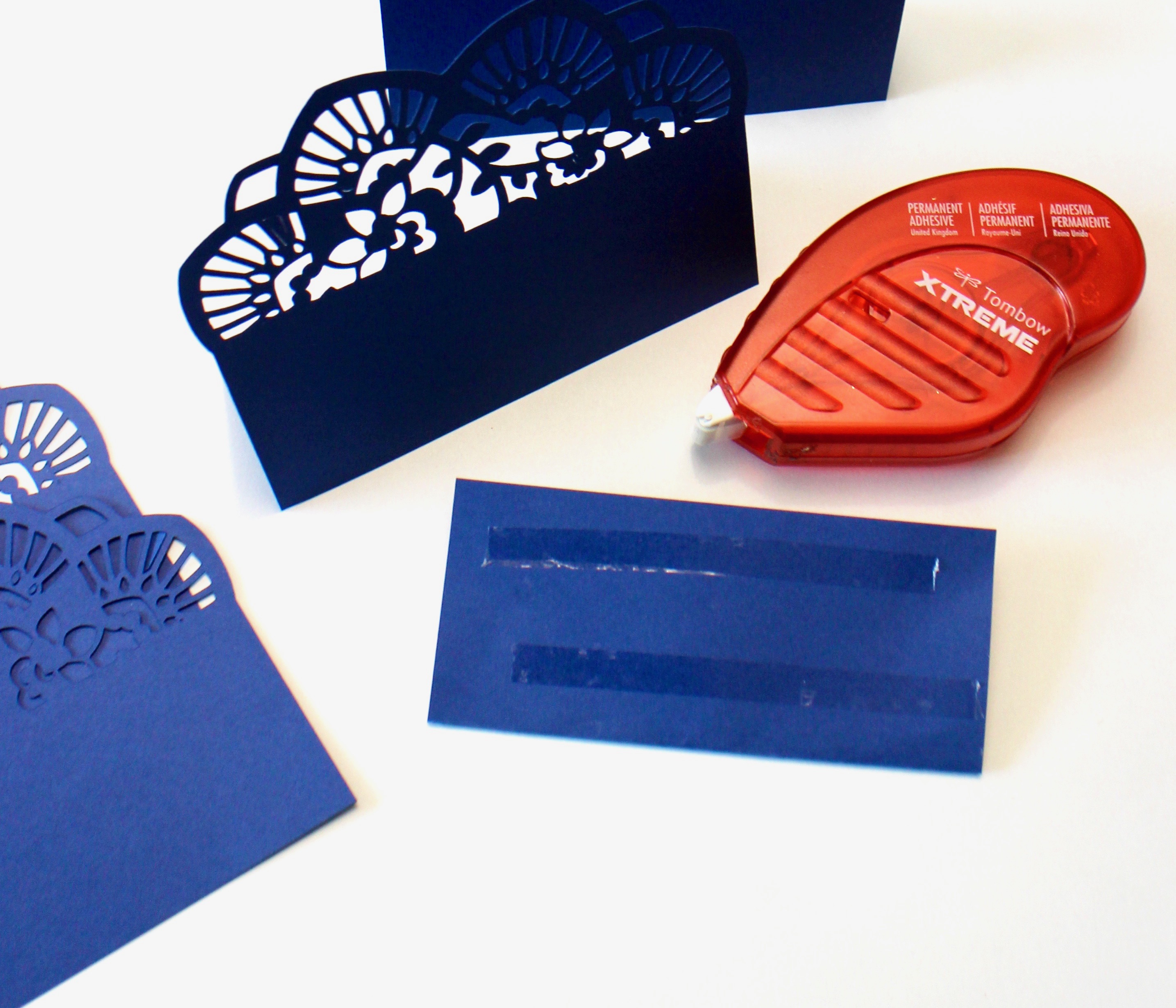 The tents to make the place cards stand up were made from the same color cardstock as the filigree piece. Cut 4″ x 4″ pieces and fold in half to create the tent. Use a bone folder for a nice crisp fold. The next step was to adhere the filigree card to the front of the tent. I used Tombow Xtreme Adhesive to make sure they remain together well for the event, it’s 5 times stronger than other adhesive runners! Only the best for this project! Remeber when using Tombow Xtreme, use a 90-degree swipe to ensure a clean cut.