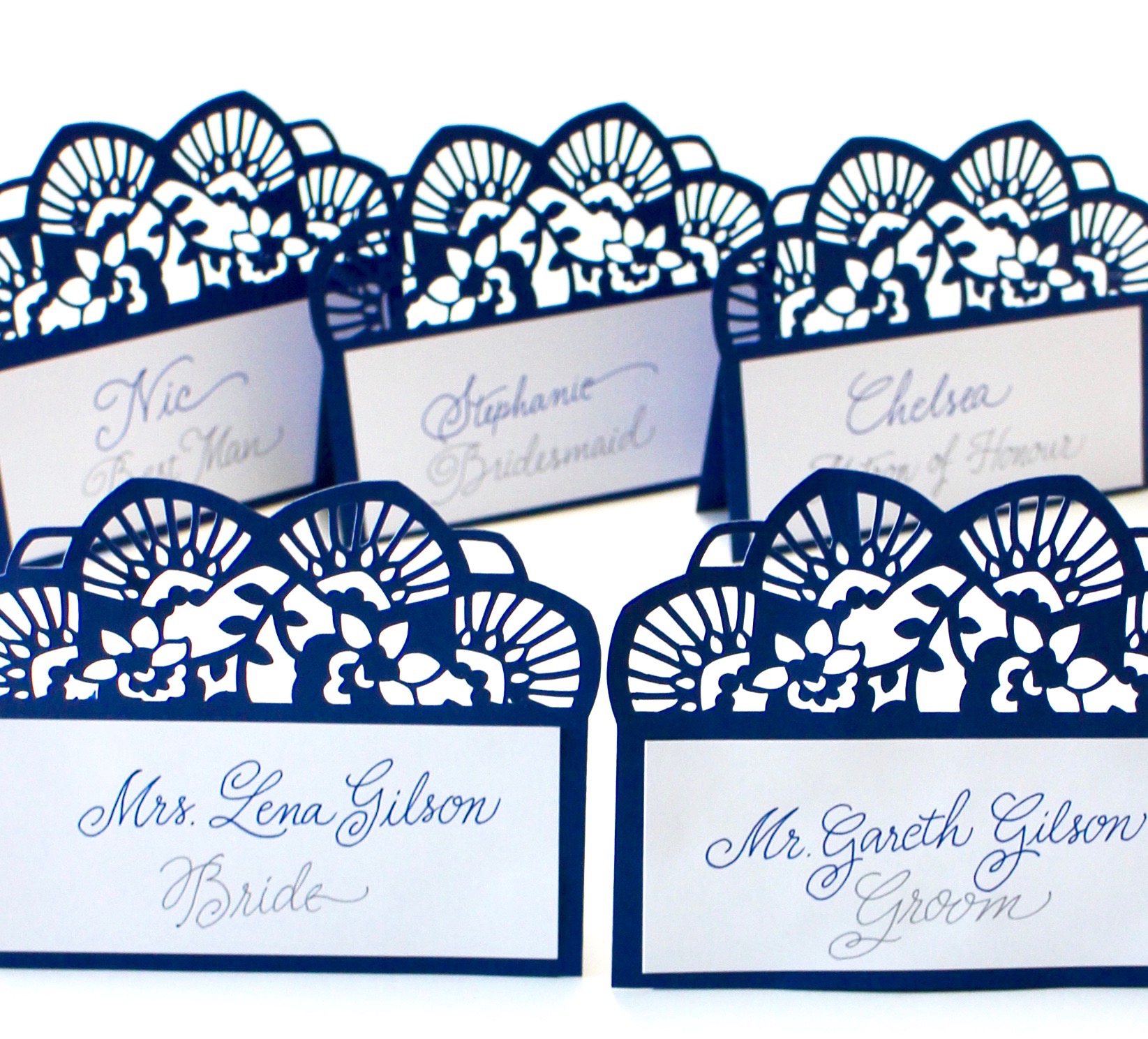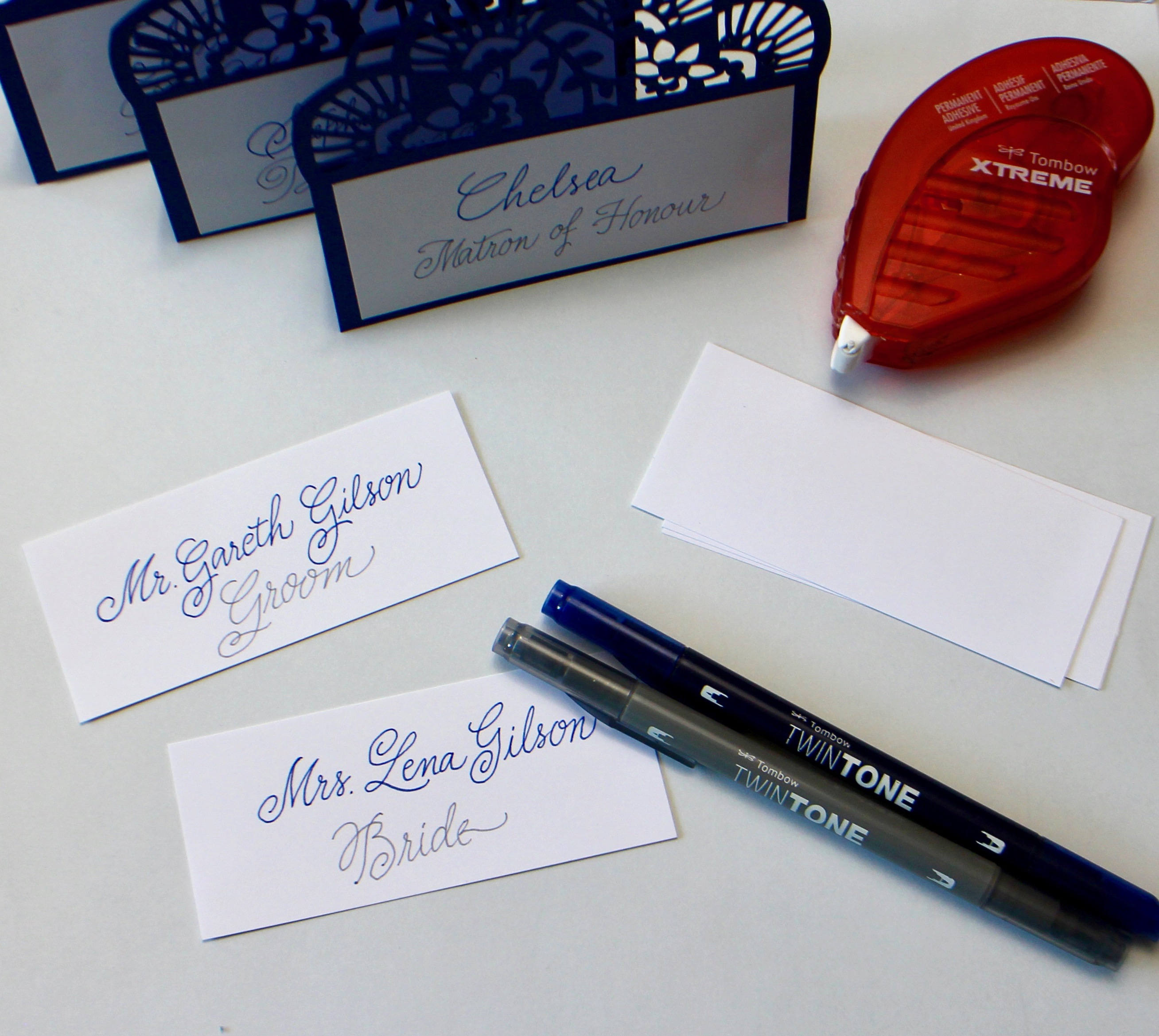 Here are some of the finished place cards. You can easily make your own plain place cards without the filigree top. Use your very best hand lettering and they will look amazing! Congratulations Lena and Gareth! Enjoy your special day with friends and family! Do you have a wedding or other special event coming up? Remeber Tombow products for the creating quality projects!