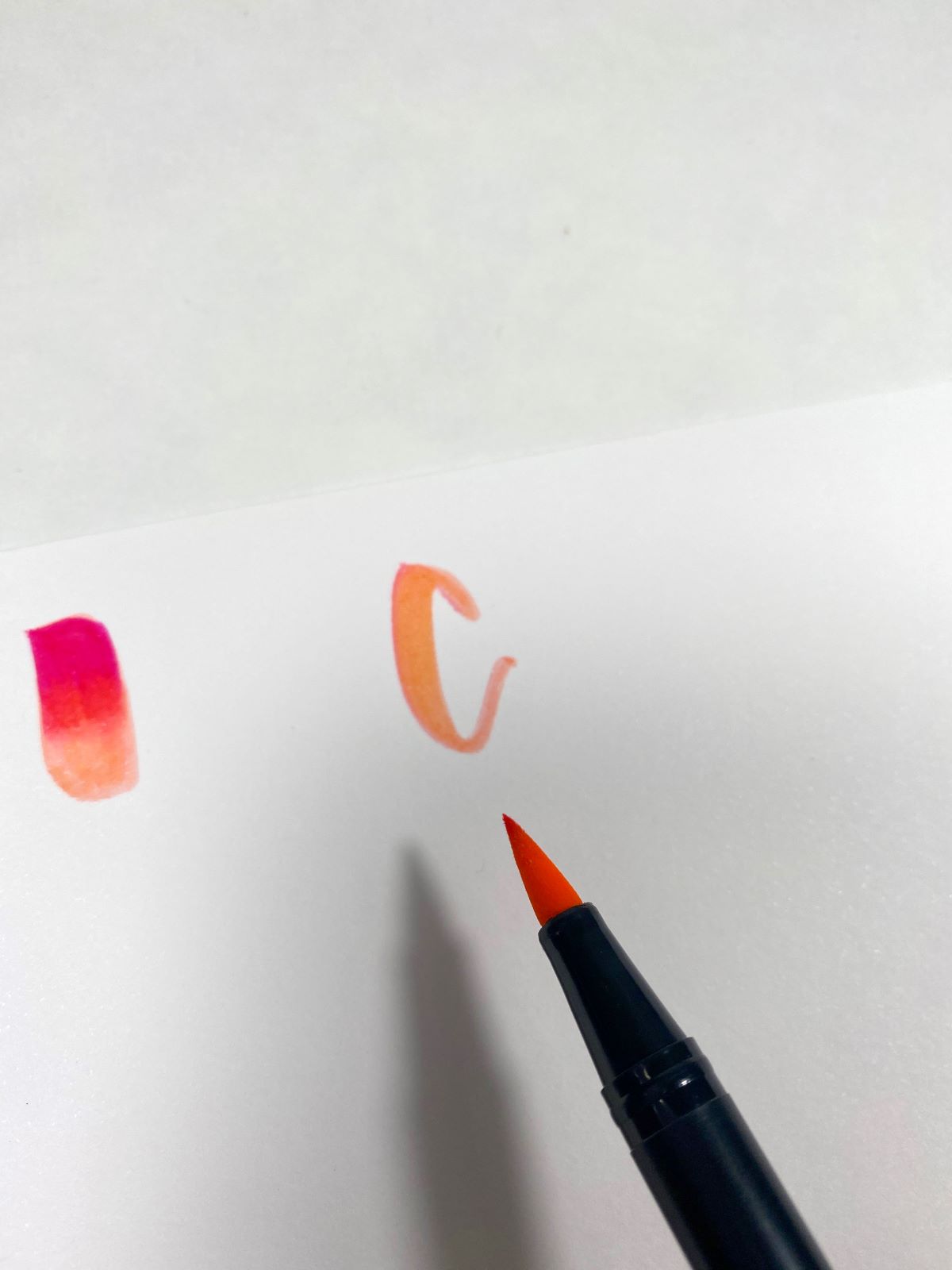For the first step, add a base of Dual Brush Pen 873 to the paper. Then add Dual Brush Pen 725 to the top half of the letter.