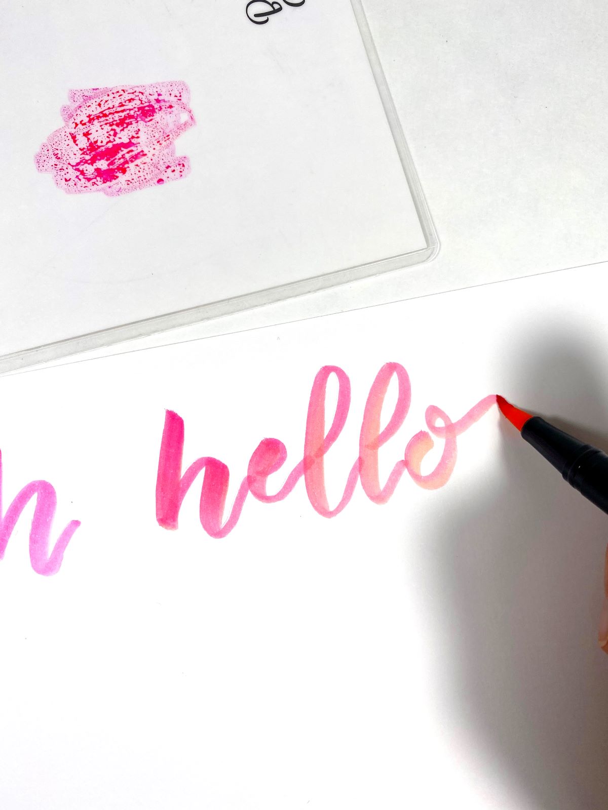 Scribble ink from two different Dual Brush Pens directly onto the Blending Palette. I used Dual Brush Pens 725 and 873 below. Use Dual Brush Pen 873 to pick up Dual Brush Pen 725 getting as much ink on the tip of 873 as you can. Then letter out your word.