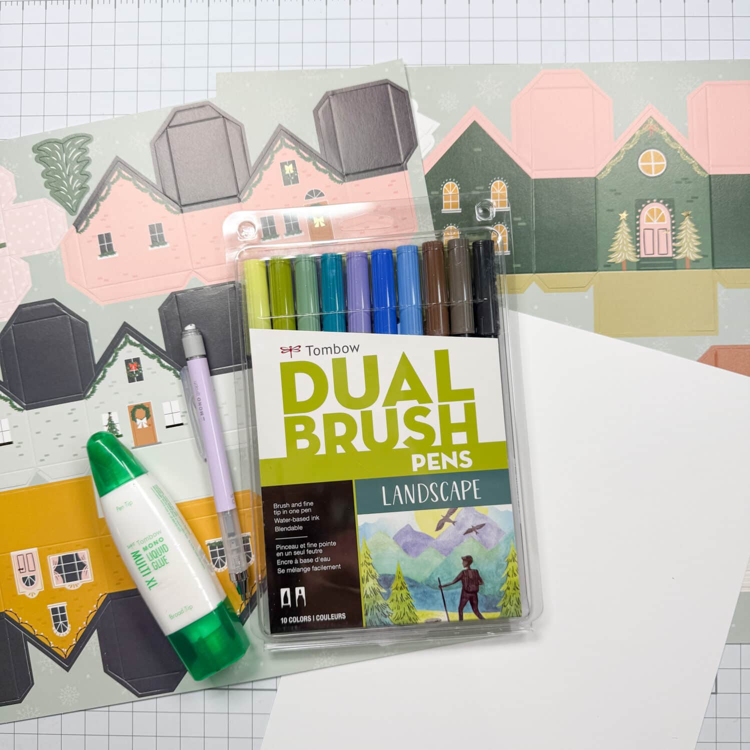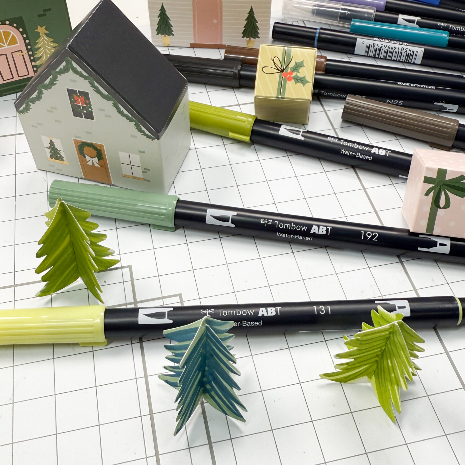 When the holidays roll in, I love decorating with pieces that feel handmade and cozy—so this year I built a tiny paper Holiday Village you can display on a cake stand, tray, or mantel. The whole project came together with my Tombow trio: the MONO Graph Mechanical Pencil for crisp planning, Dual Brush Pens for lush, blendable color, and MONO Multi Liquid Glue for sturdy, long-lasting assembly. Simple printable house templates and a few hand-drawn evergreens turn into a cheerful scene in no time.
