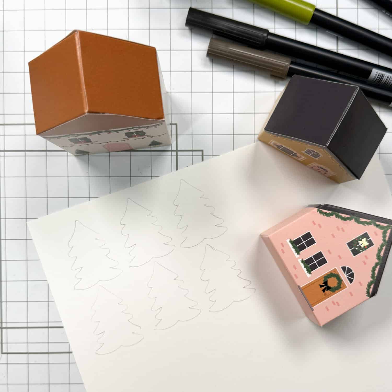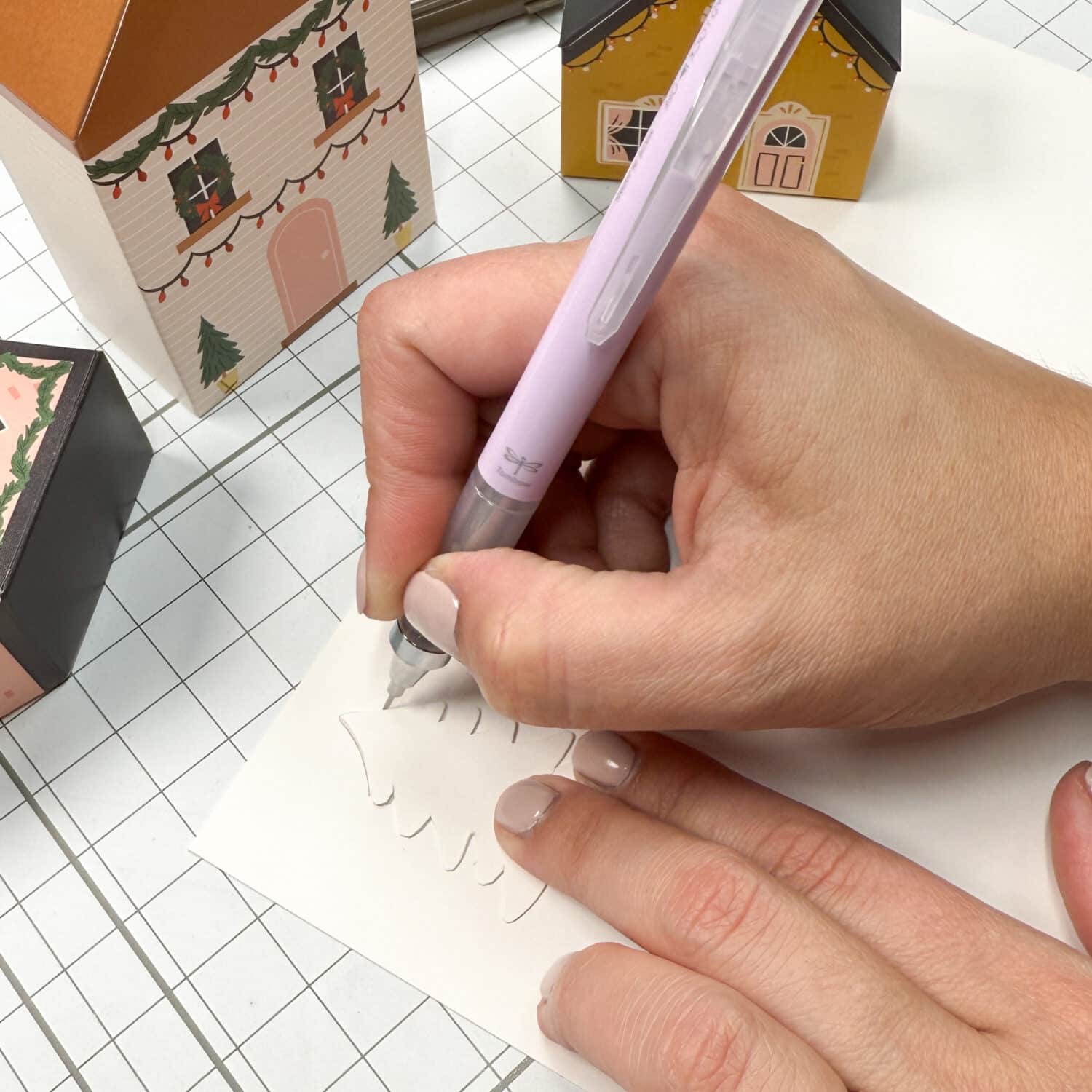 I started by assembling the pre-cut house pieces with Tombow MONO Multi Liquid Glue—the pen tip along the tabs for precise control and a light brushed coat on the roof panels—pressing each seam for a crisp, square finish. For the trees, I used the MONO Graph to draw one evergreen on a scrap of cardstock as a reusable template, then traced that template onto heavyweight white cardstock to get identical tree shapes every time. The pencil’s fine lead kept the lines clean, and the eraser lifted any marks after cutting.