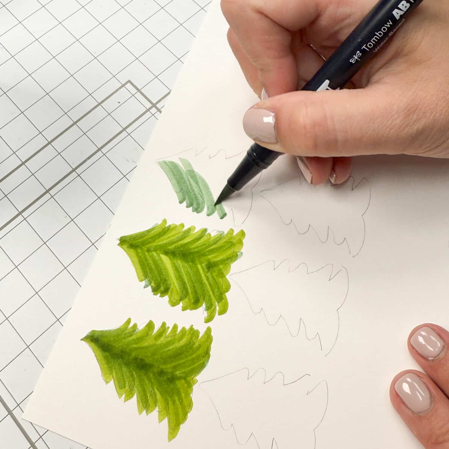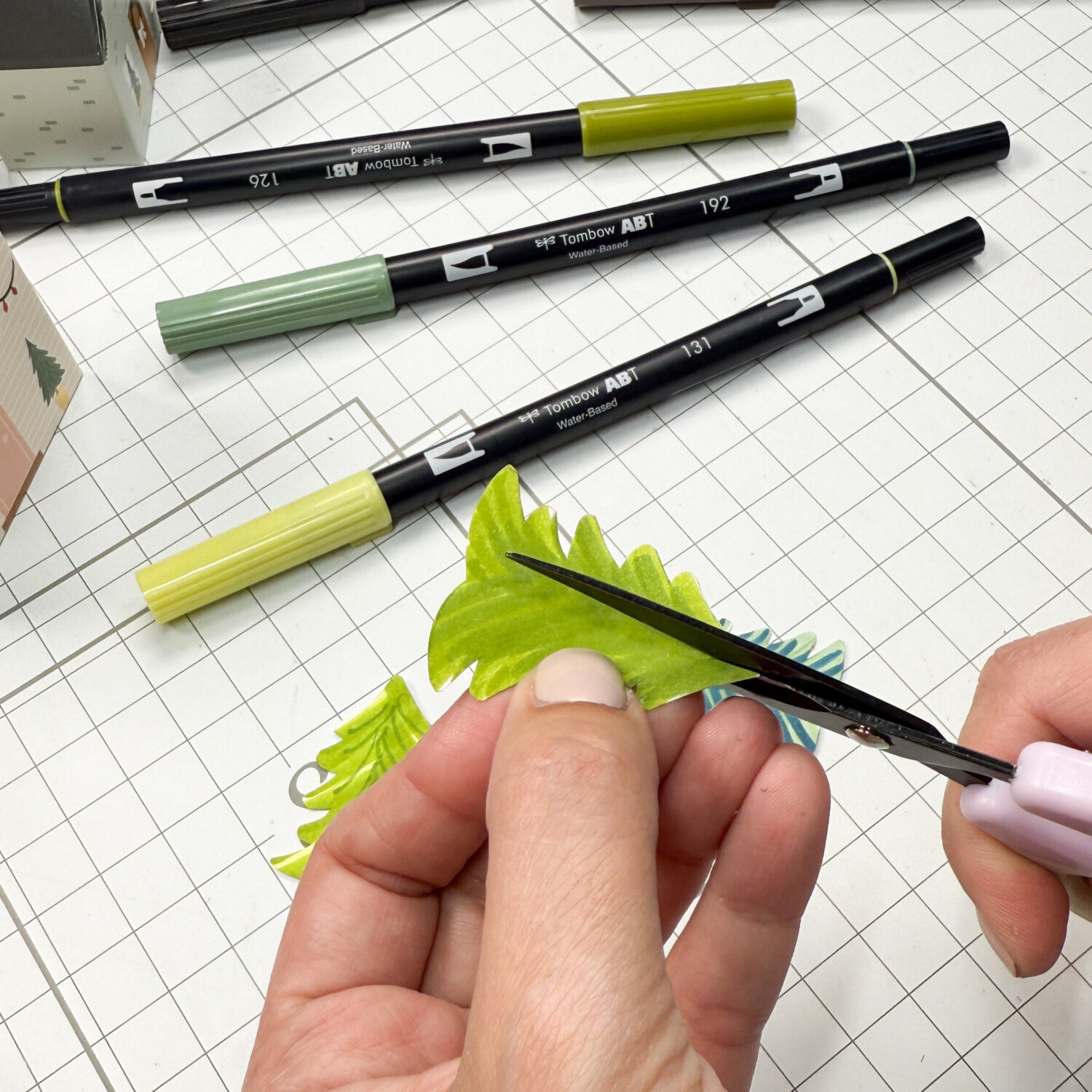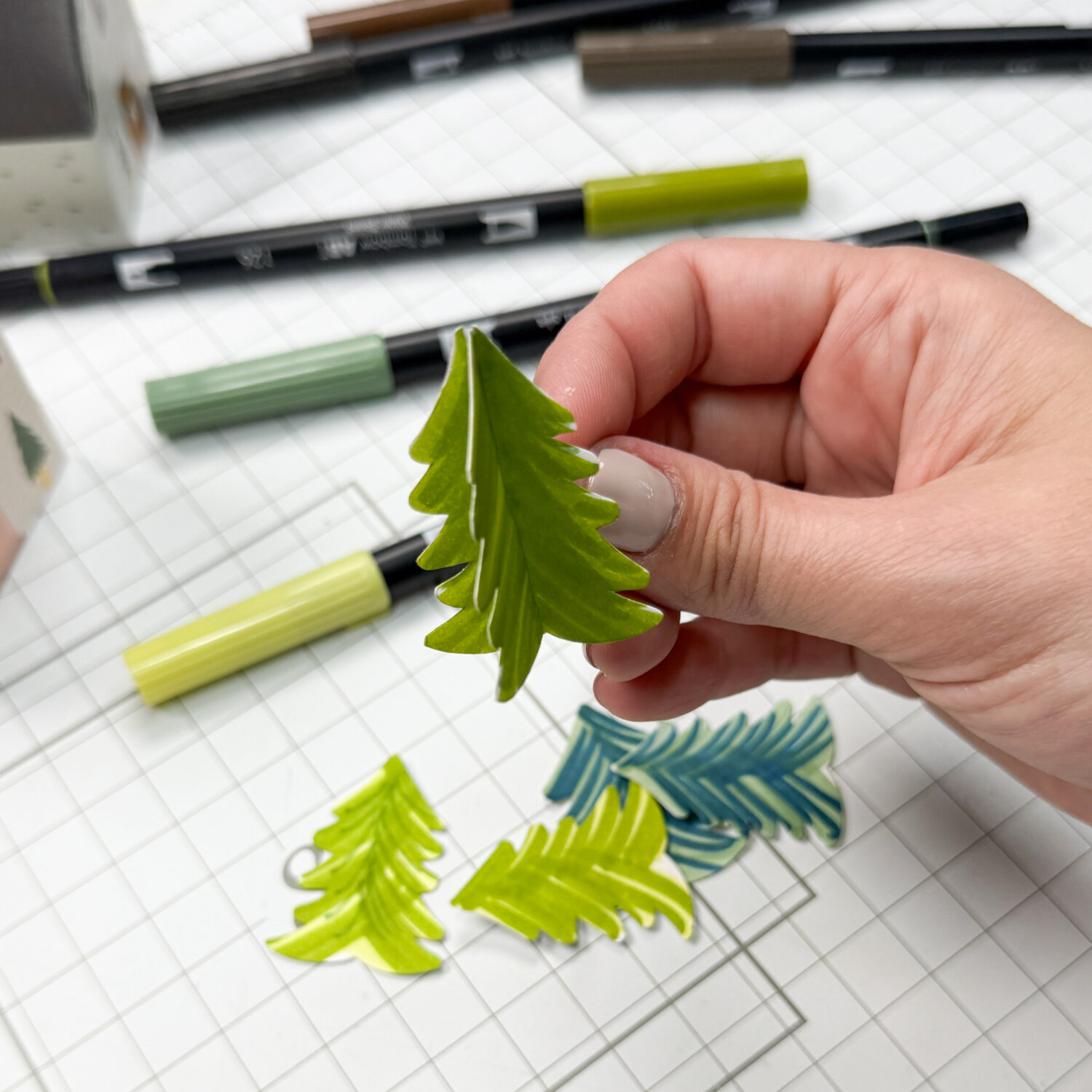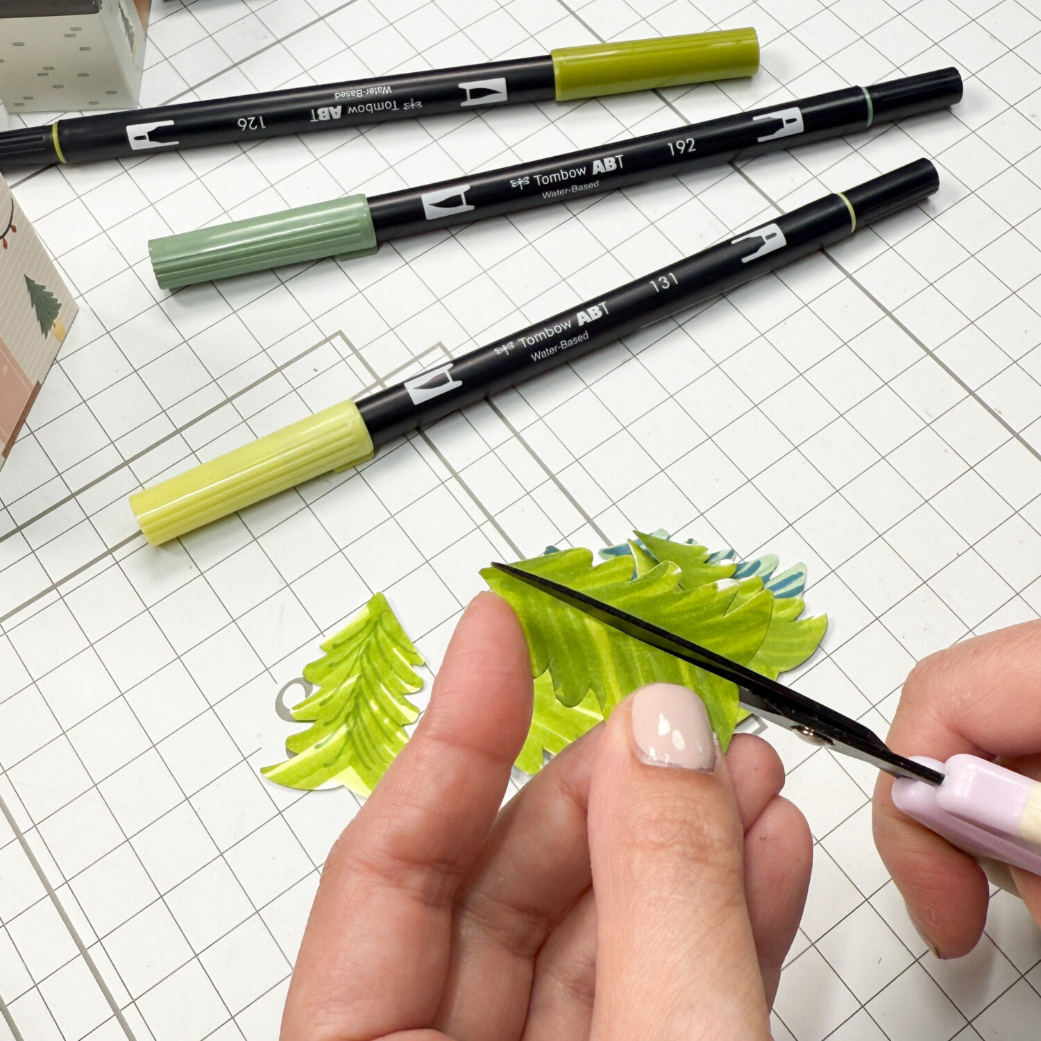 Next came color. Using Tombow Dual Brush Pens (hello, Landscape greens!), I layered brush-tip strokes in two to three shades to create soft, feathery “needles,” then switched to the fine tip to add shadow and detail along edges. After cutting the trees, I kept each one together with a simple slotted method: I made two identical pieces, cut one from the top down to the middle and the other from the bottom up to the middle, then slid them together like a puzzle to form a 3D stand-up.